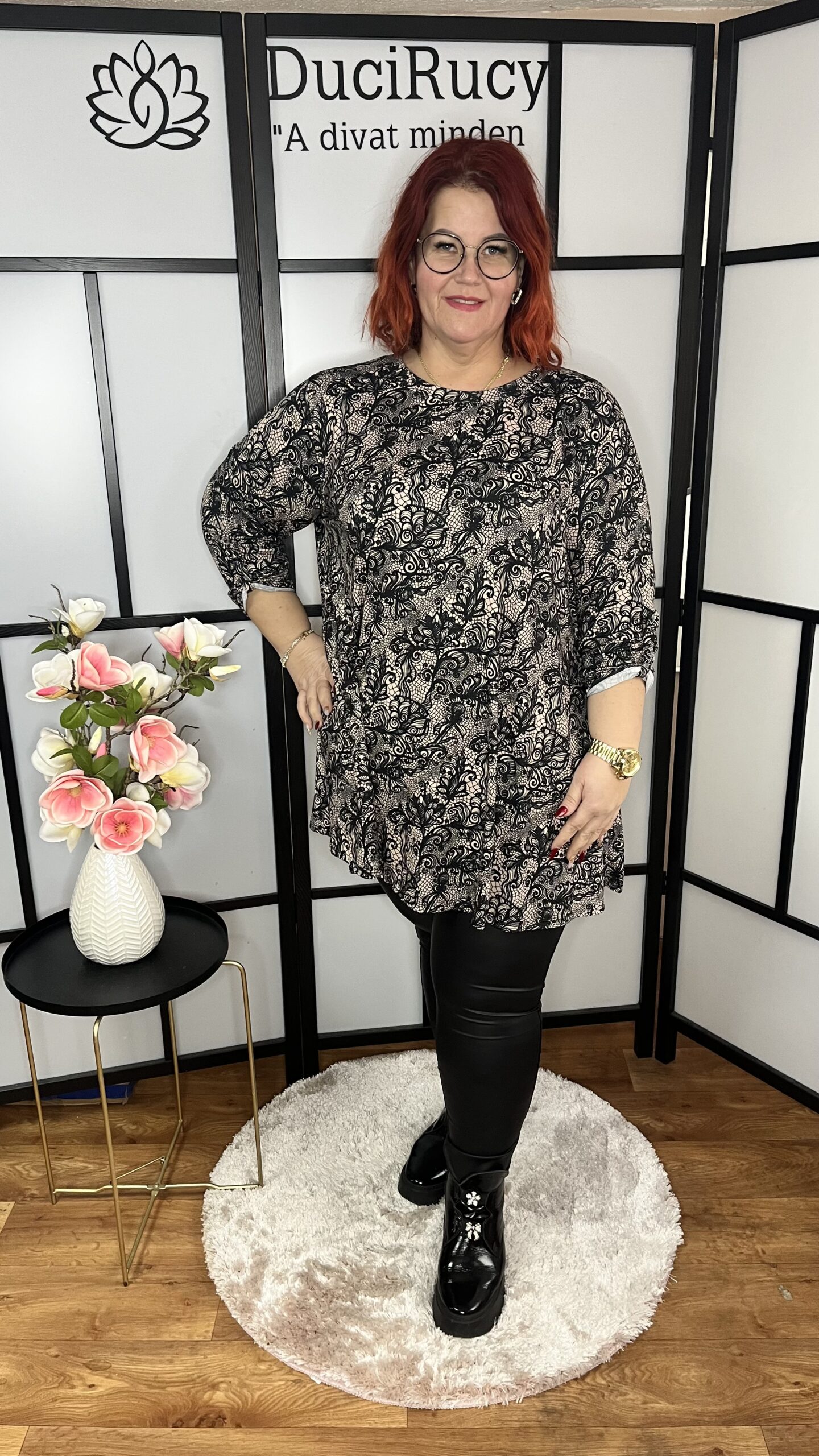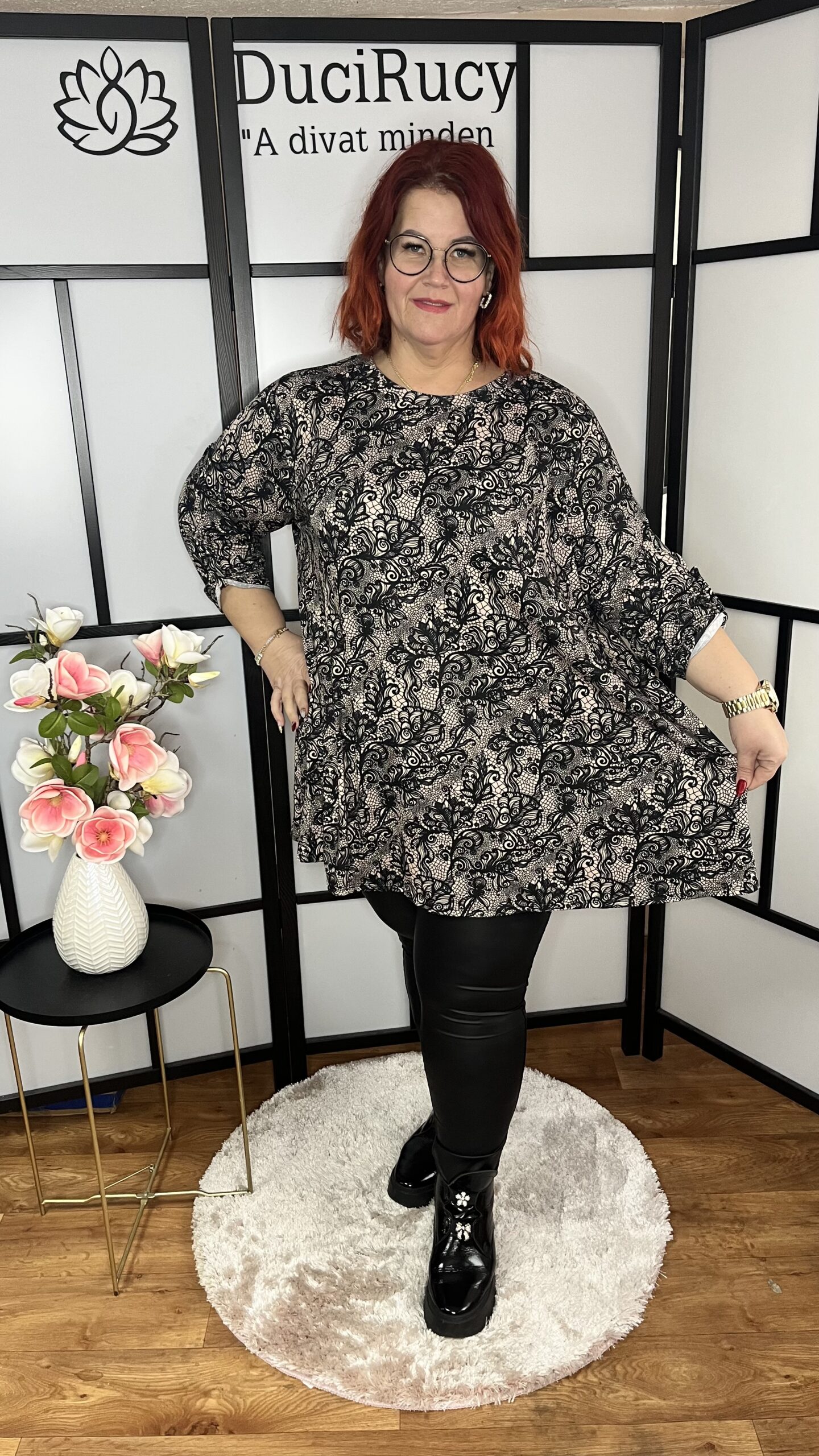Pihe-puha kimo anyagból készült, felgombolható ujjú, A vonalú mintás tunika. A tunika anyaga rugalmas. Szuper választás akár egy bőrnadrághoz, farmerhoz, bőr leggingshez is.