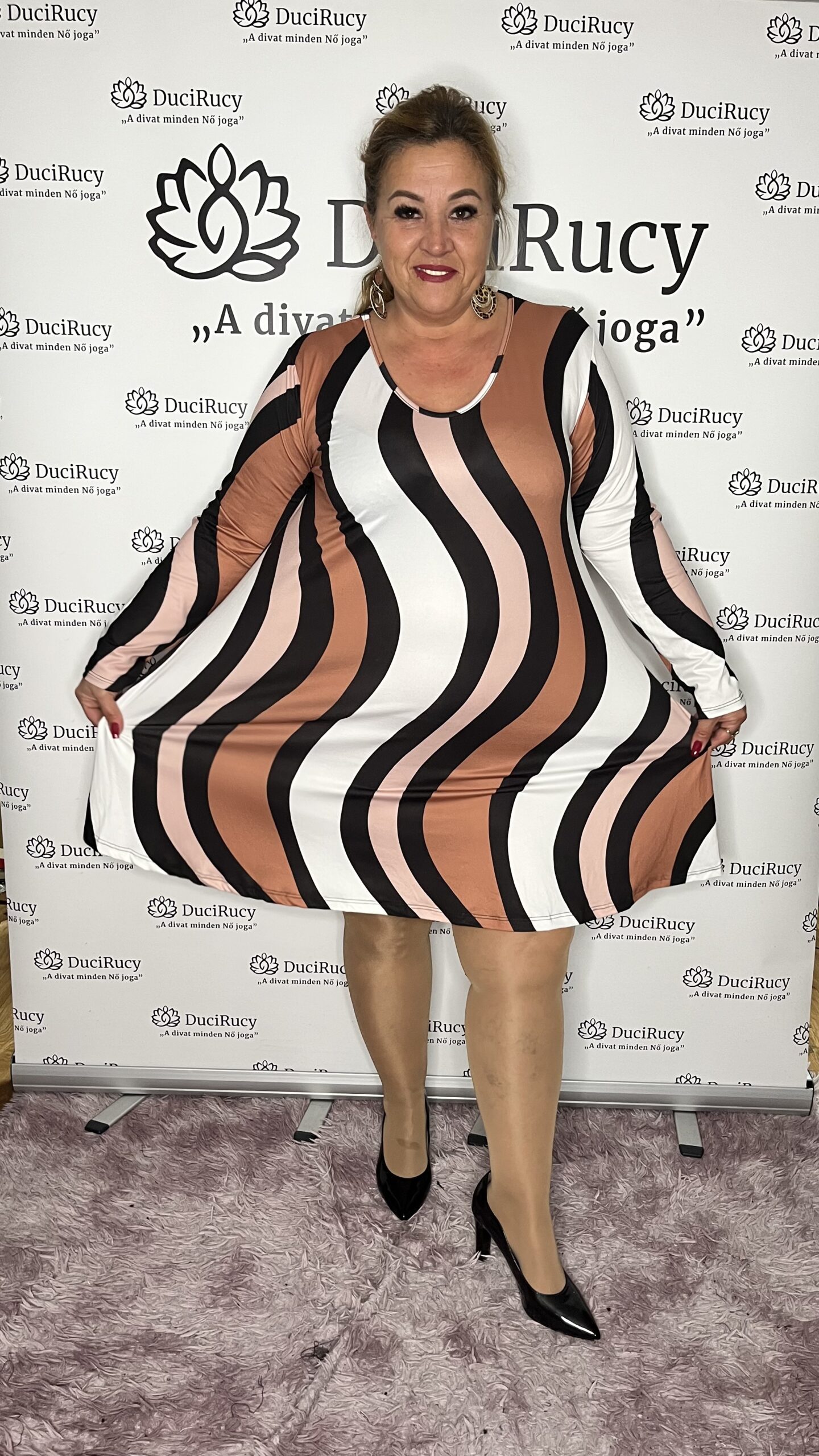 Pihe-puha pamut anyagú, V nyakú, A vonalú ruha barna hullám mintával