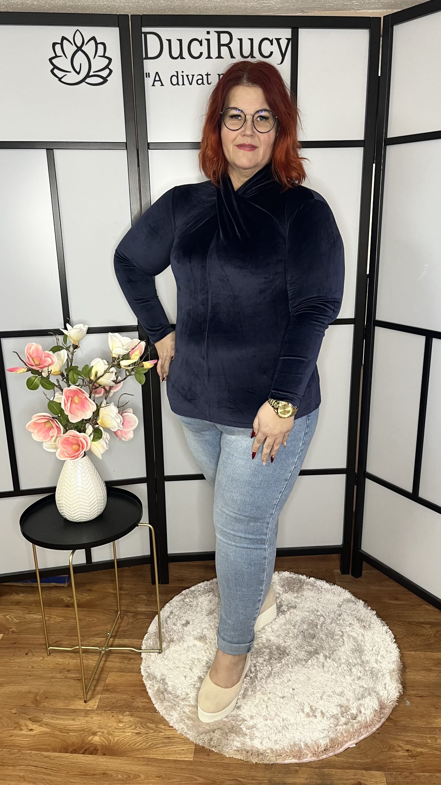 Plüss anyagból készült, csavart nyakú egyszerű felső. Bármilyen alkalomra kiváló választás lehet, akár egy mellénnyel, blézerrel, farmerdzsekivel. A felső anyaga rugalmas. Kb. 42-48 méretig ajánljuk.