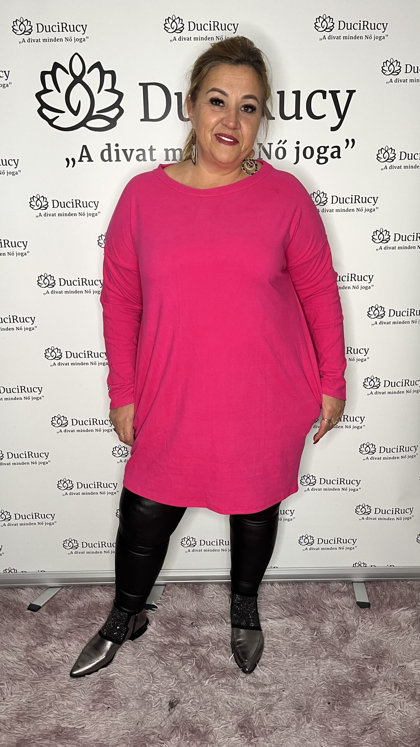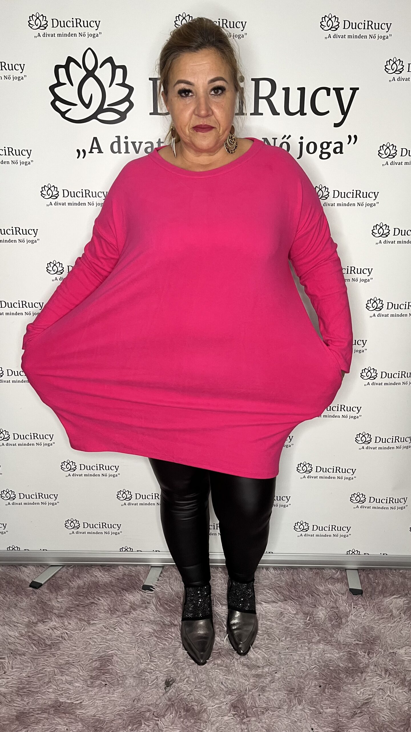 A képeken a modell is ezt a méretet viseli. A modell méretei: mell- és csípőbőség 120 cm, magassága 167 cm.