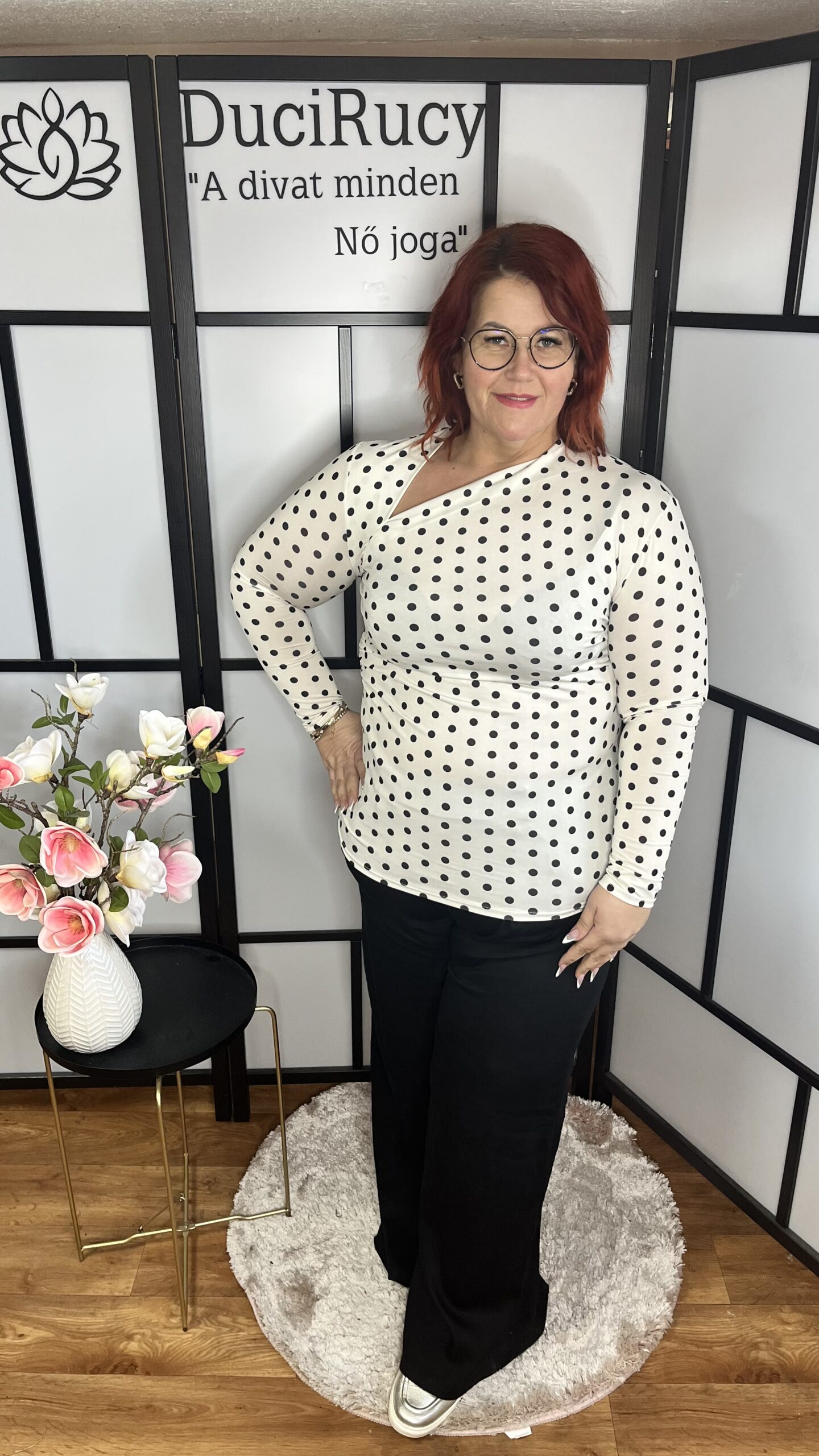Fantasztikus, jól összetartó anyagú, rafinált nyakkivágású csodás olasz, pöttyös felső. Bármilyen alkalomra kiváló választás, akár egy szoknyával, akár egy nadrággal.