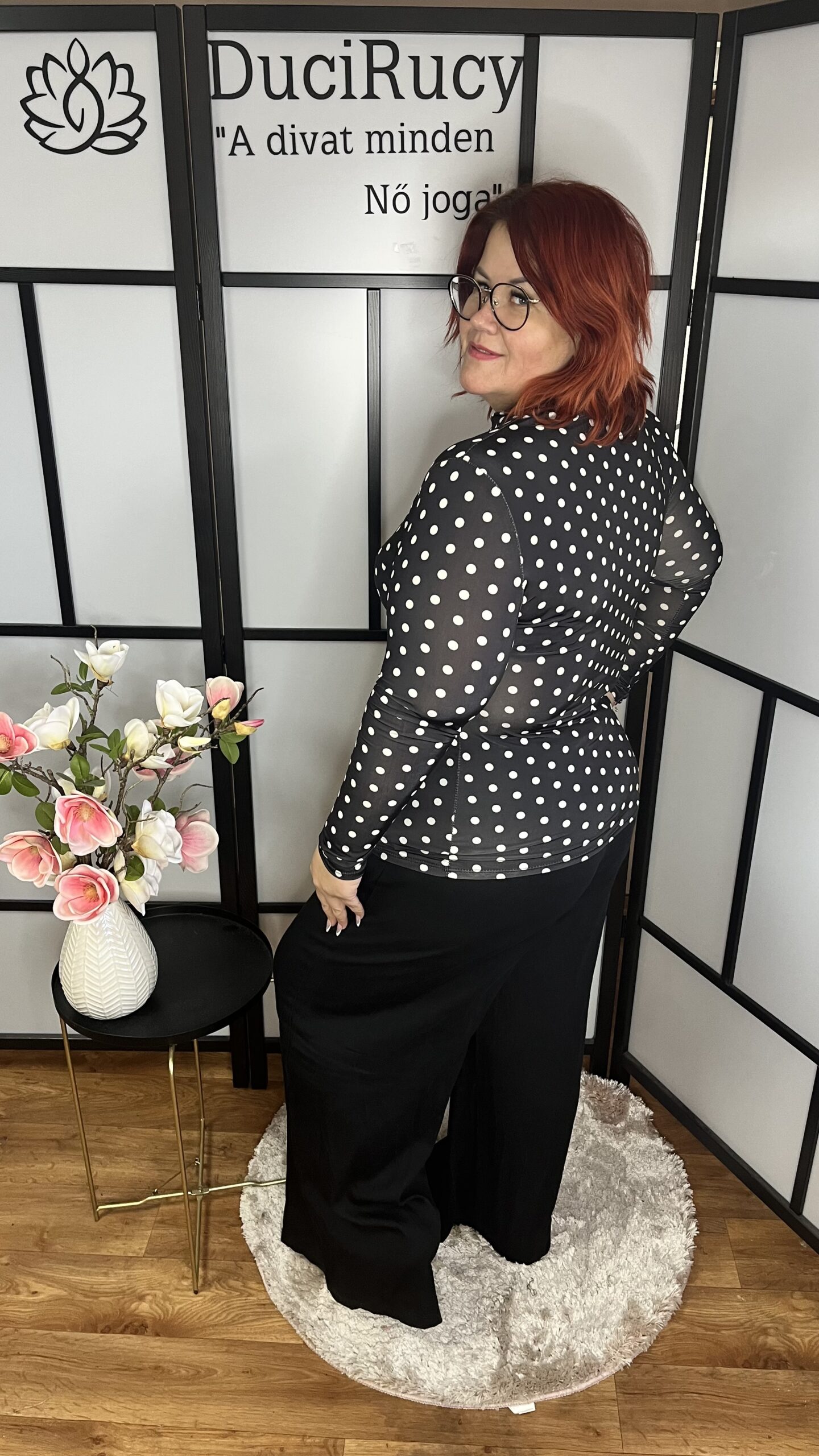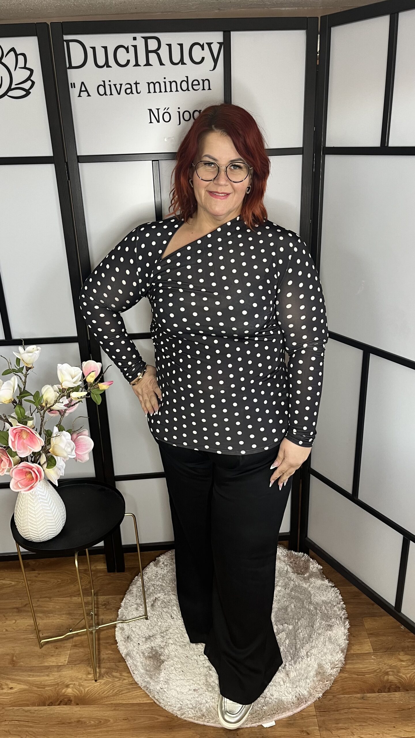 Fantasztikus, jól összetartó anyagú, rafinált nyakkivágású csodás olasz, pöttyös felső. Bármilyen alkalomra kiváló választás, akár egy szoknyával, akár egy nadrággal.