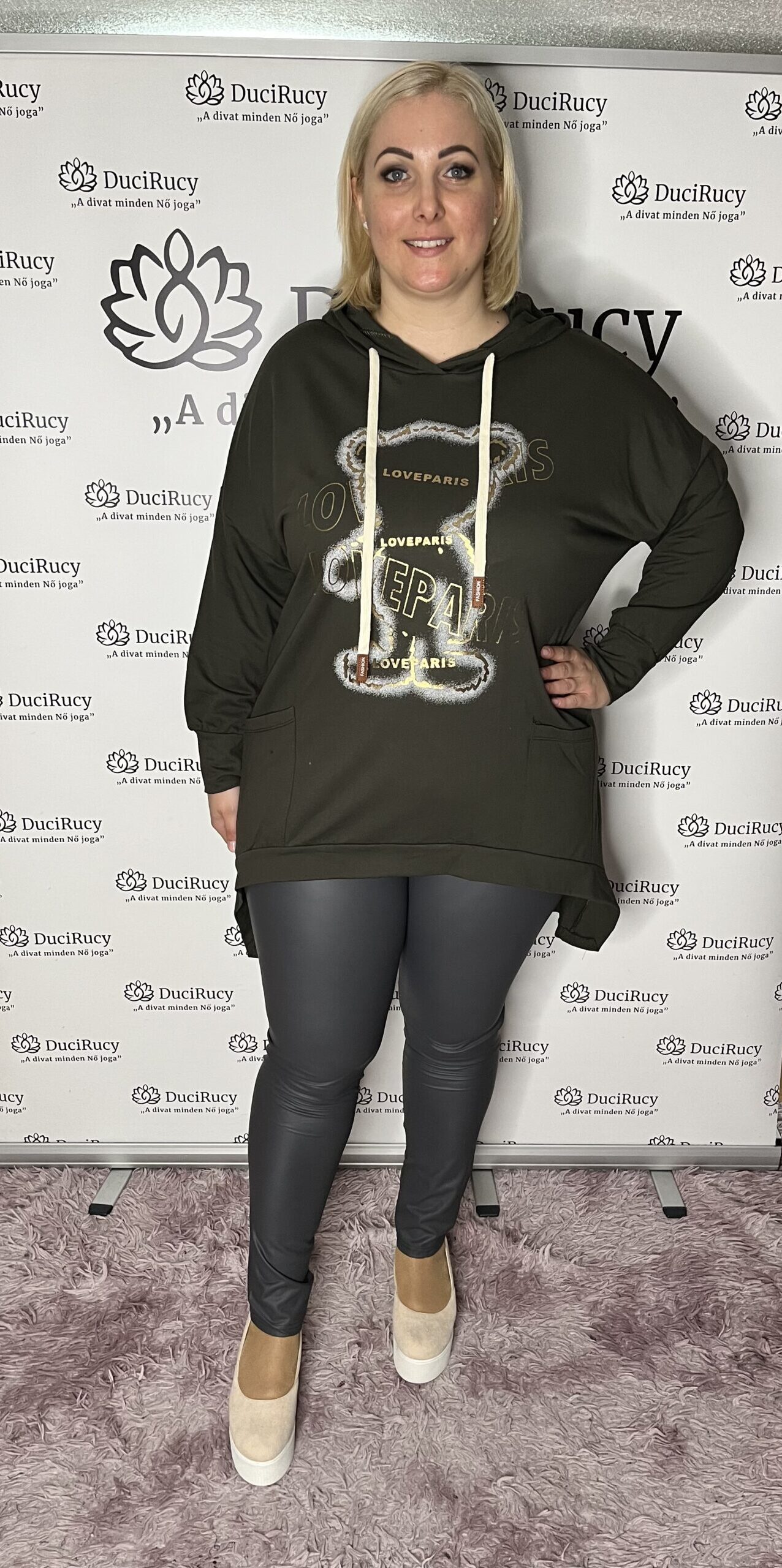 A modell a 4/5XL-es méretet viseli. A modell méretei: derékbősége 100 cm, csípőbősége 130 cm, magassága 175 cm.