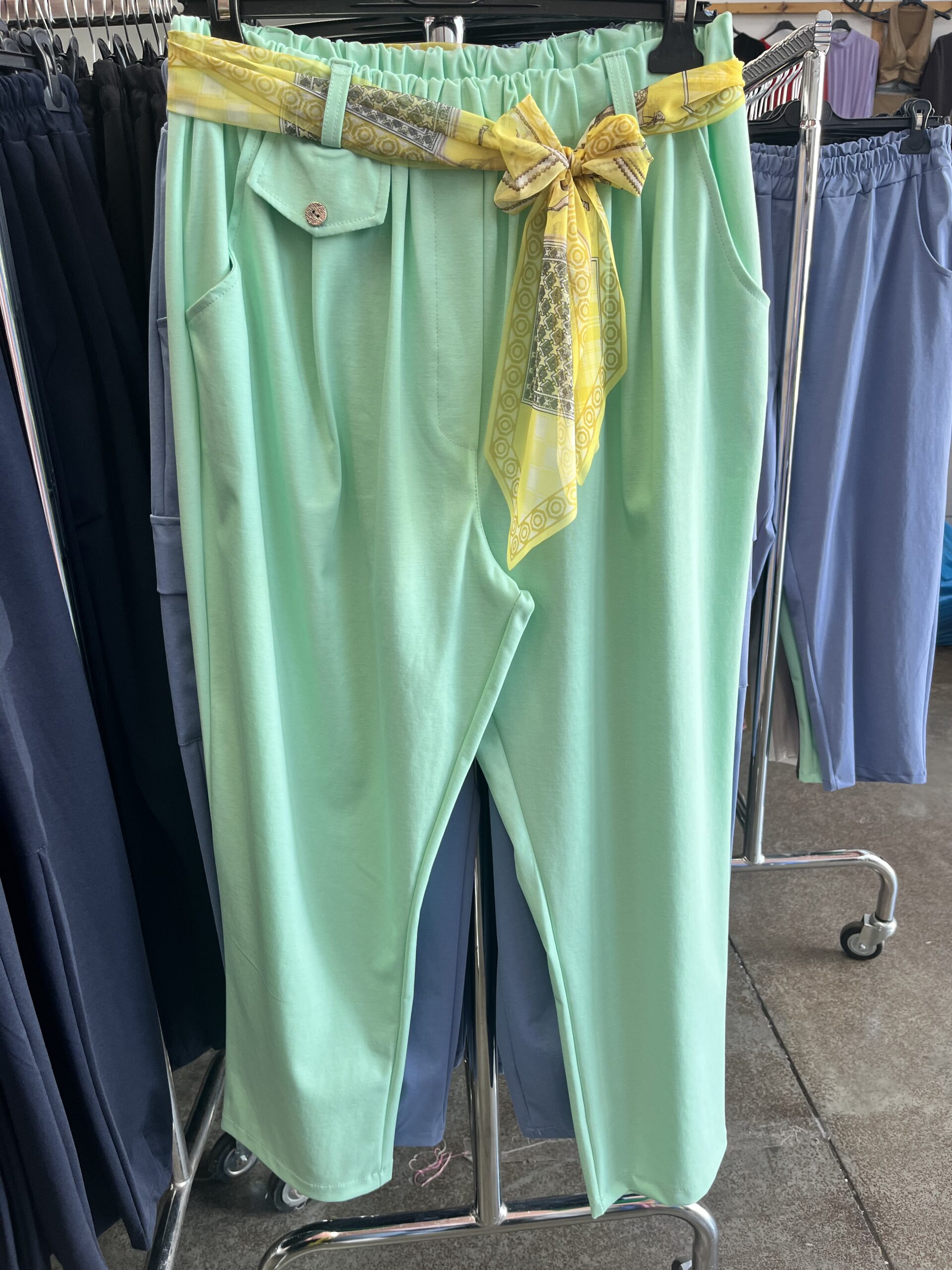 Selyem sál övvel díszített nadrág sötétkék színben