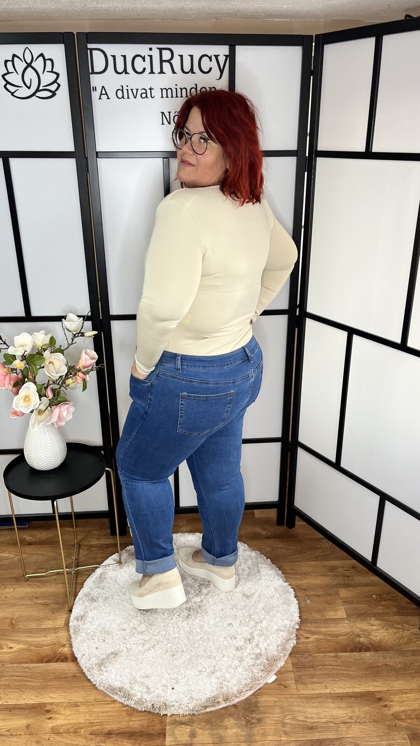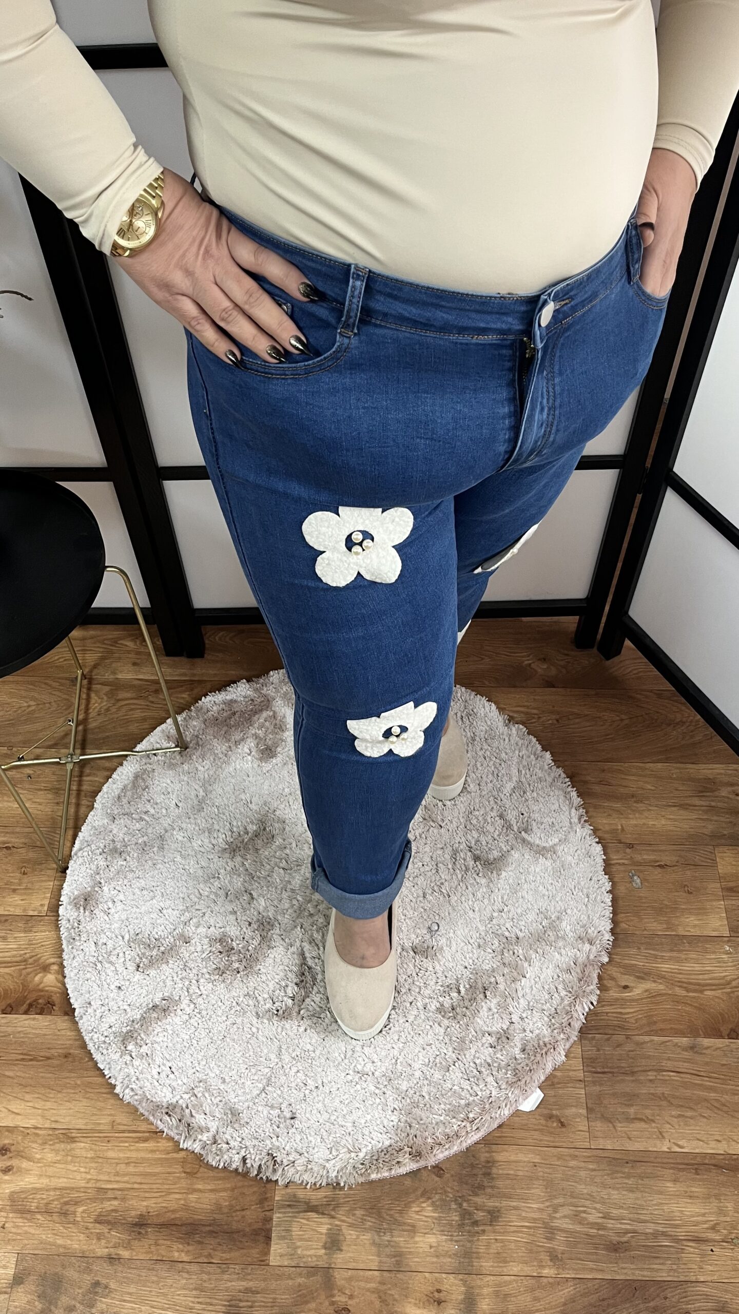 Sötétebb különleges tavaszi farmernadrág virágokkal, gyöngyökkel díszítve. Egy pólóval, sneakerrel sportosan is kiválóan mutat, de egy magassarkú cipővel elegánsan is hordható.