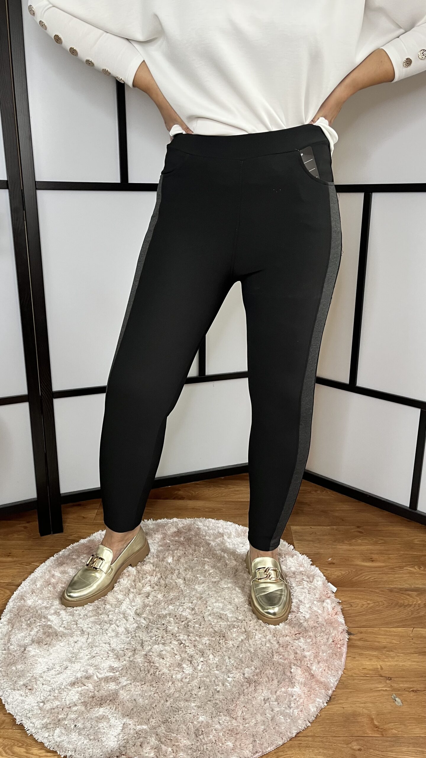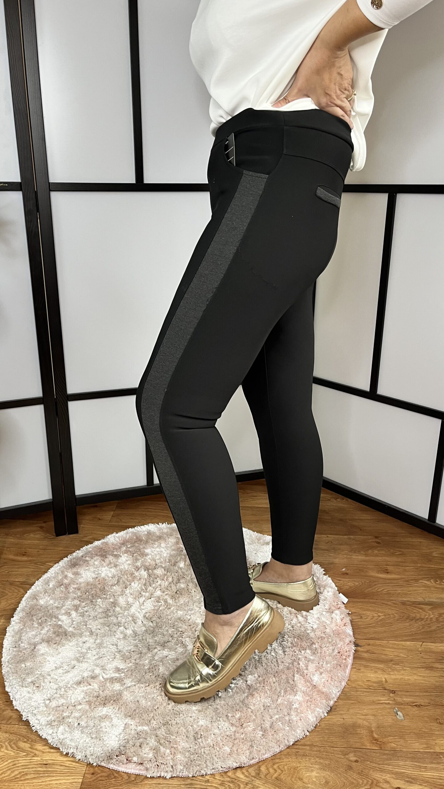 Szűk szárú gumis derekú nadrág oldalán szürke pamut betéttel díszítve. Bármilyen alkalomra felvehető, nagyon kényelmes, összetartó nadrág.