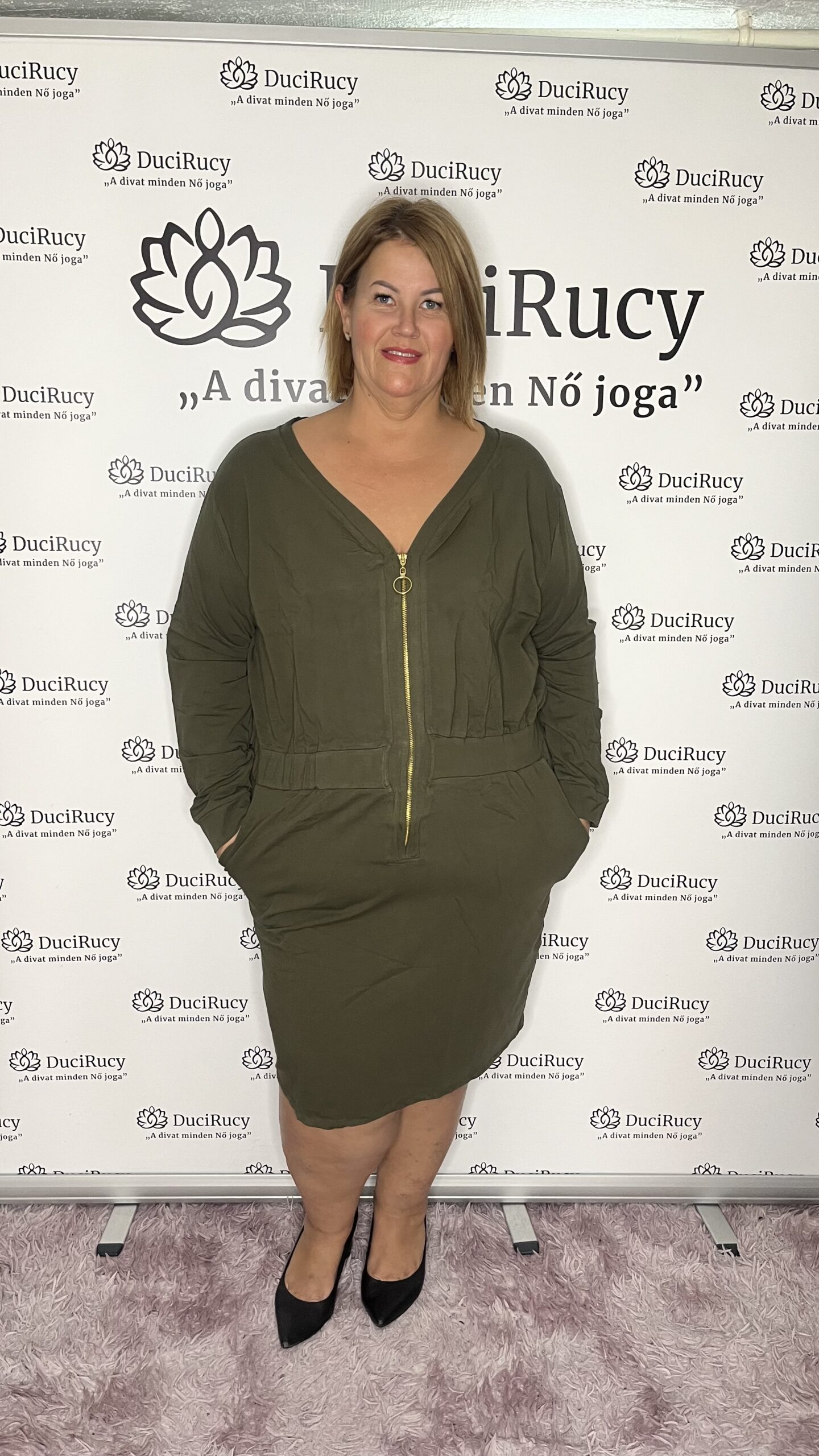 A modell a kisebbik méretet viseli a képen. Az ő méretei mellbőség: 116 cm, csípőbőség 120 cm.