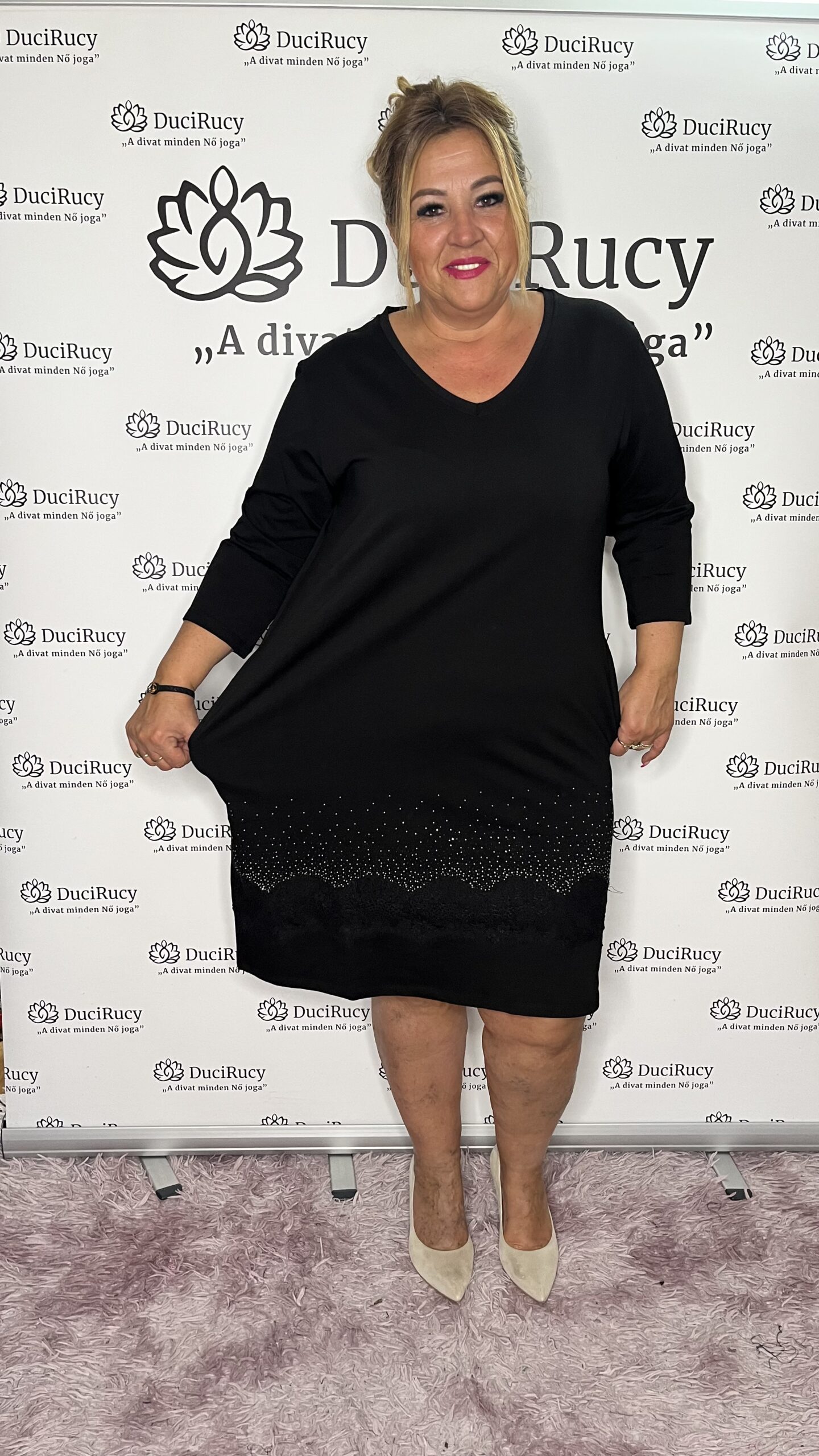 A képeken a modell is ezt a méretet viseli. A modell méretei: mell- és csípőbőség 120 cm, magassága 167 cm.