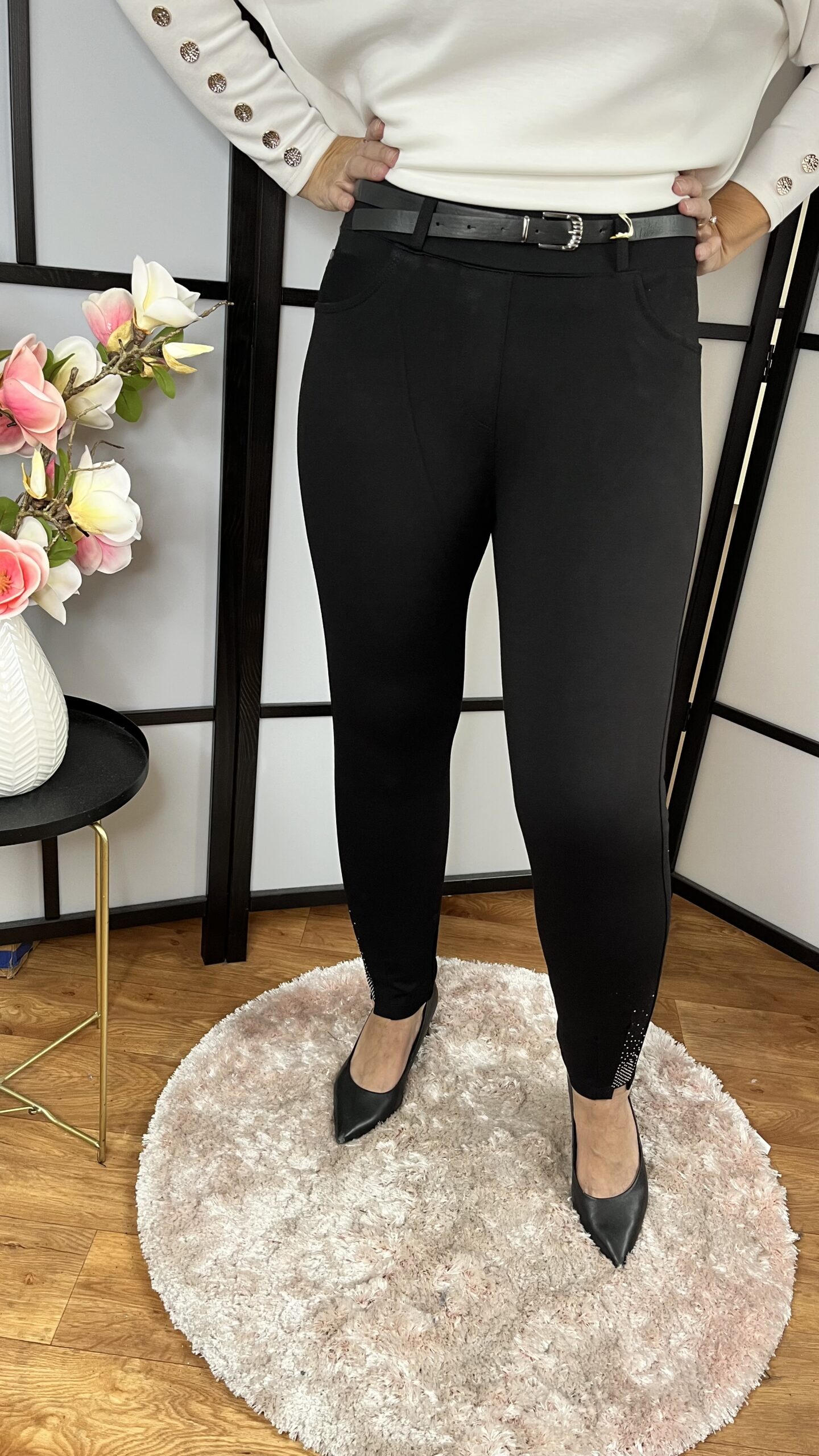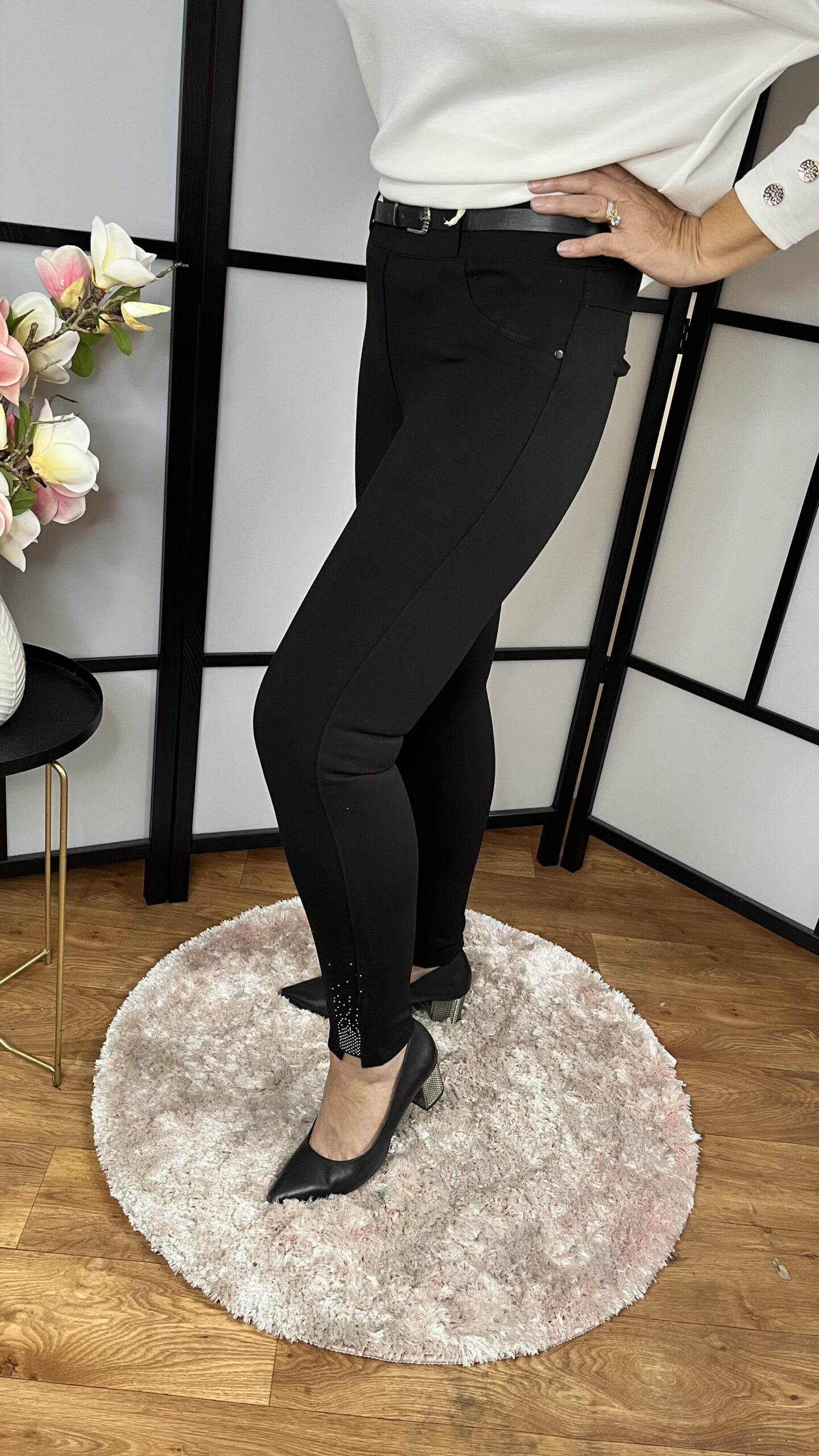 Török felső kategóriás fekete gumis derekú nadrág lábszárán kövekkel díszítve. Az anyaga fantasztikusan összetartja a viselőjét, nagyon jó alakformáló hatással bír. Gyönyörű alkalmi nadrág, bárhol megállja a helyét.