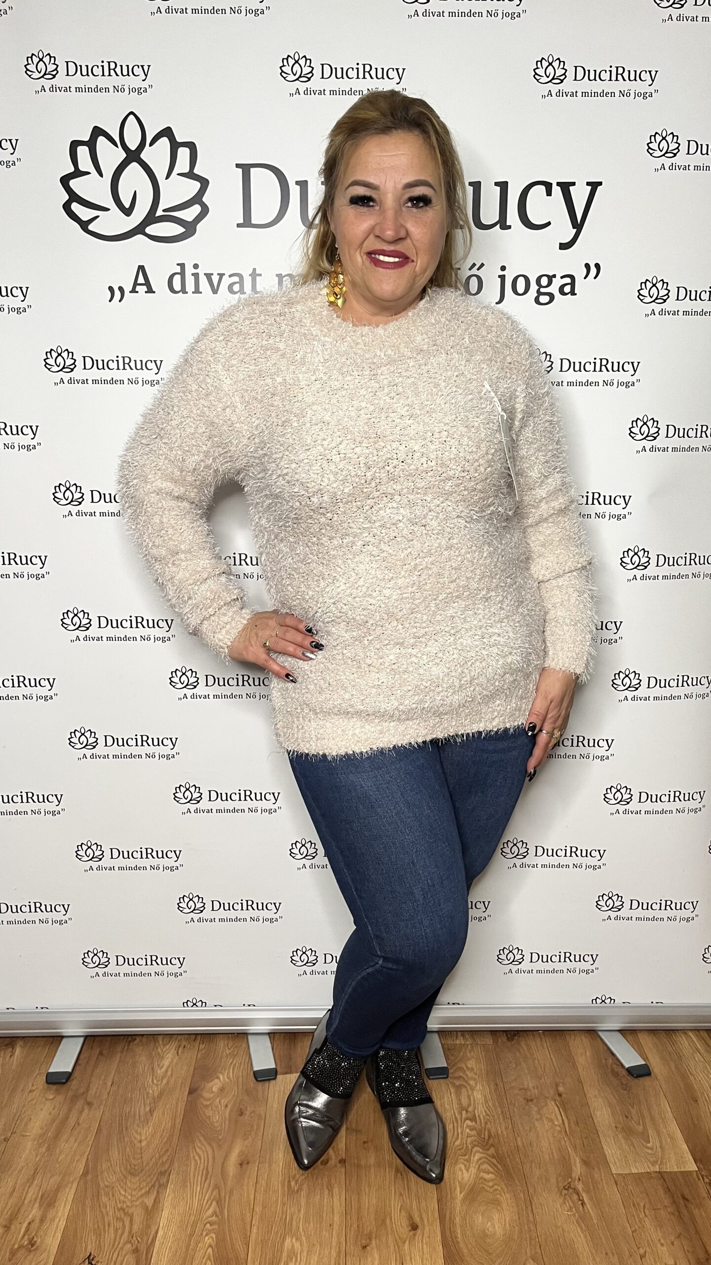 Török szörmés pihe-puha kötött félgarbós pulóver bézs színben