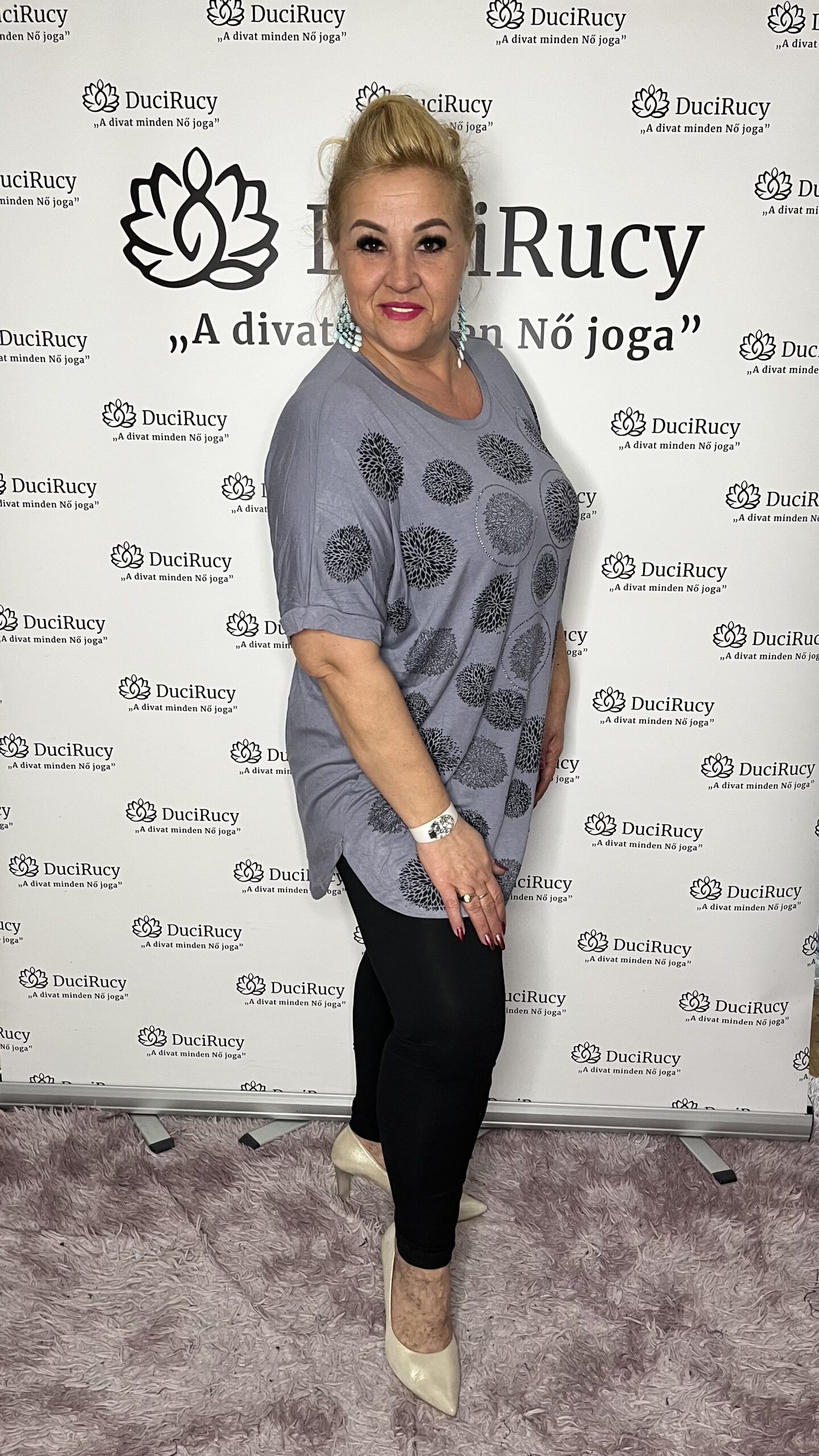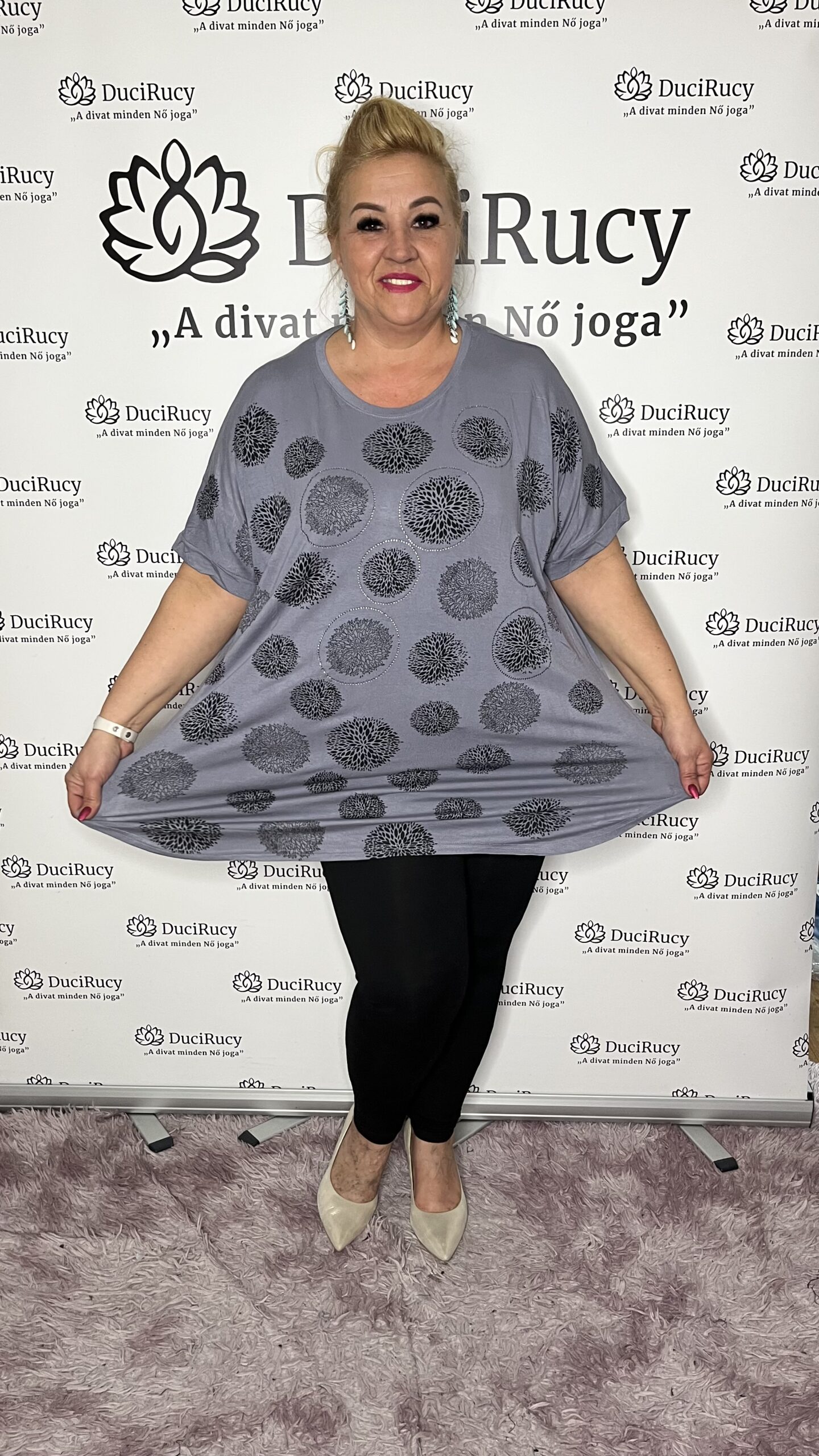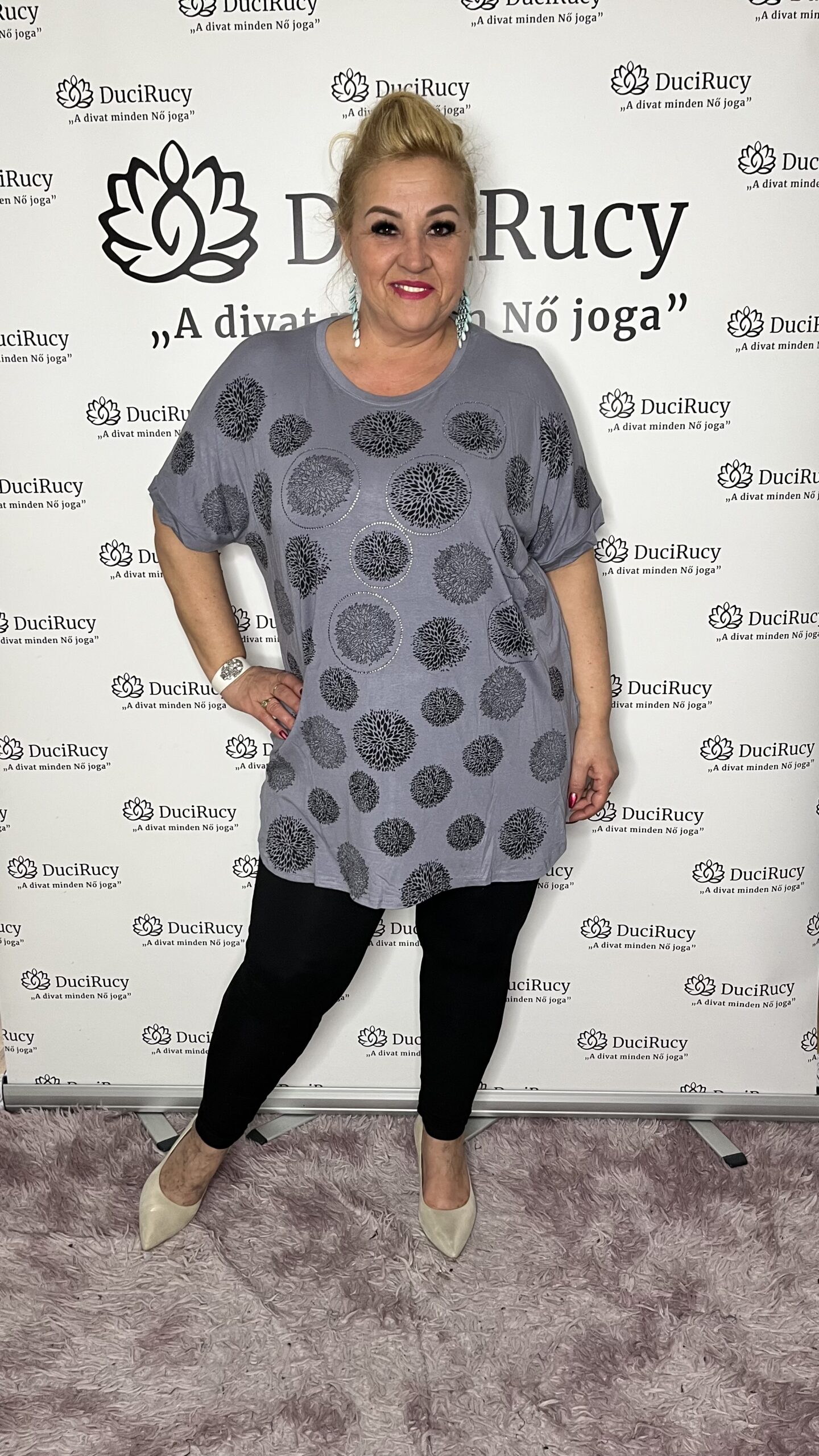Török vékonyabb pamut anyagból készült kerekített fazonú tunika elől kör mintával, diszkrét strasszokkal. Hétköznapi viseletre tökéletes választás.