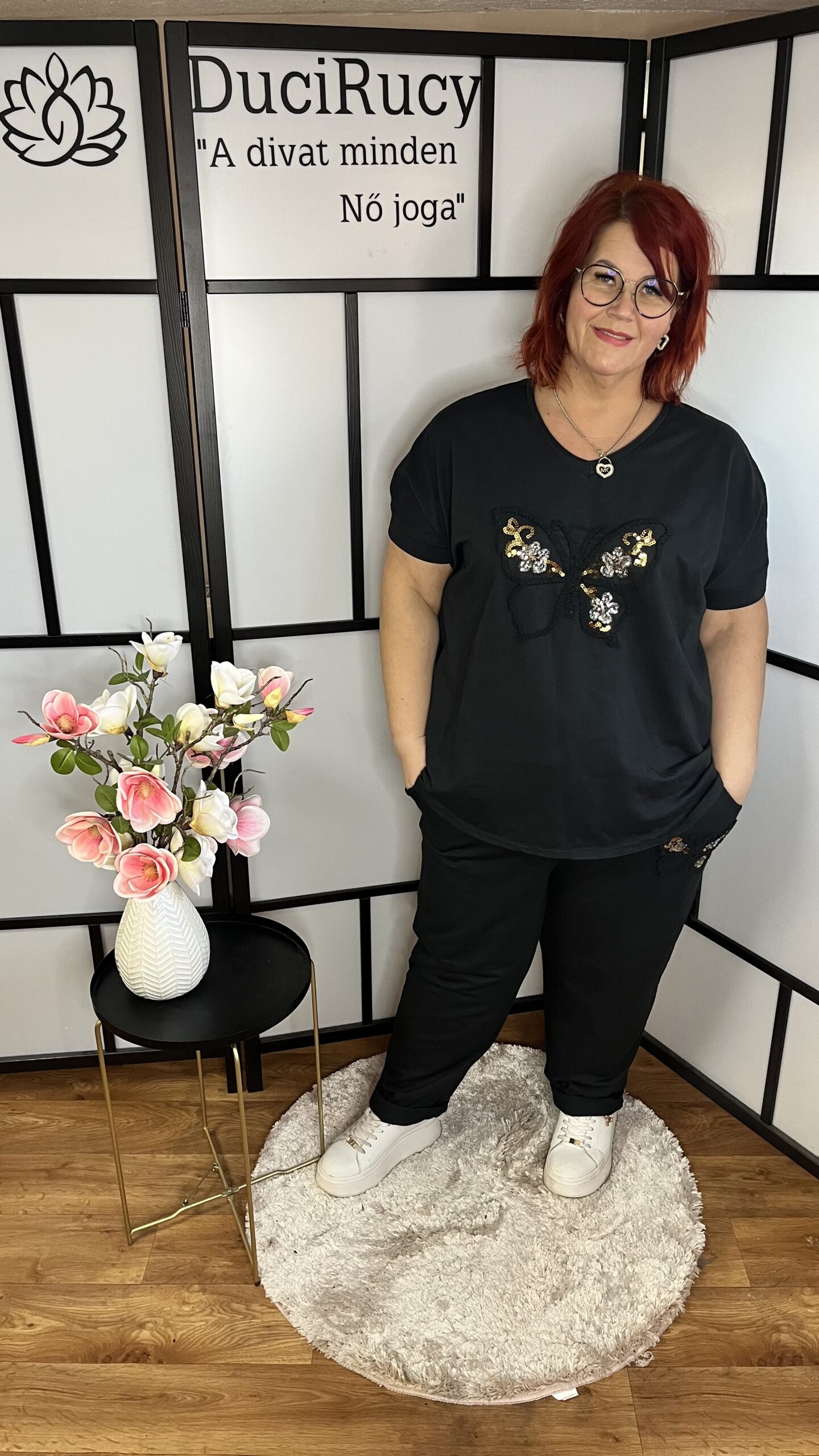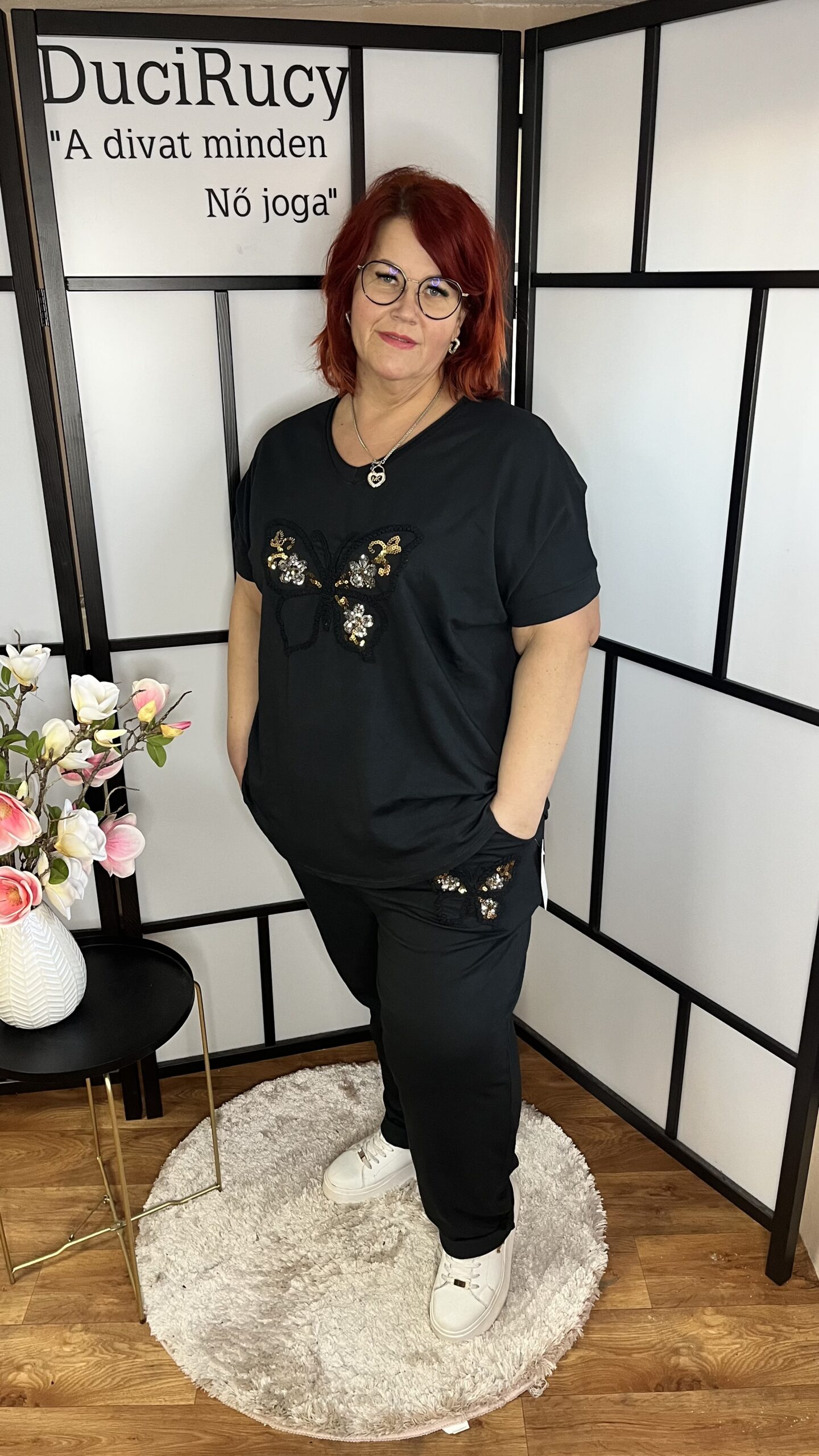 V kivágású extra minőségű pamut felső flitteres pillangó mintával fekete színben mennyiség