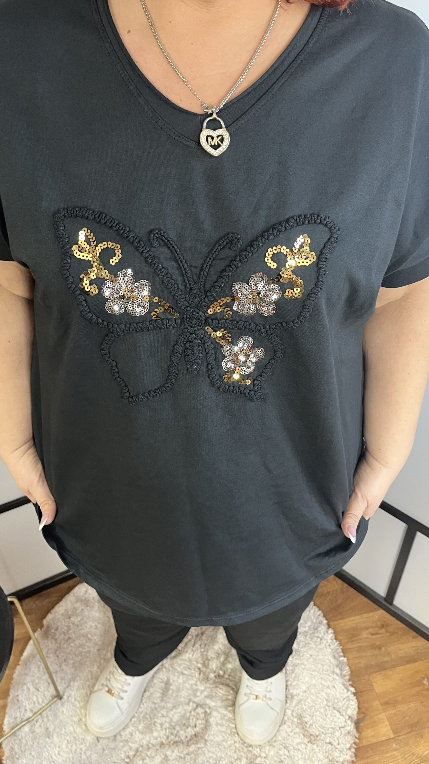 V kivágású extra minőségű pamut felső flitteres pillangó mintával fekete színben