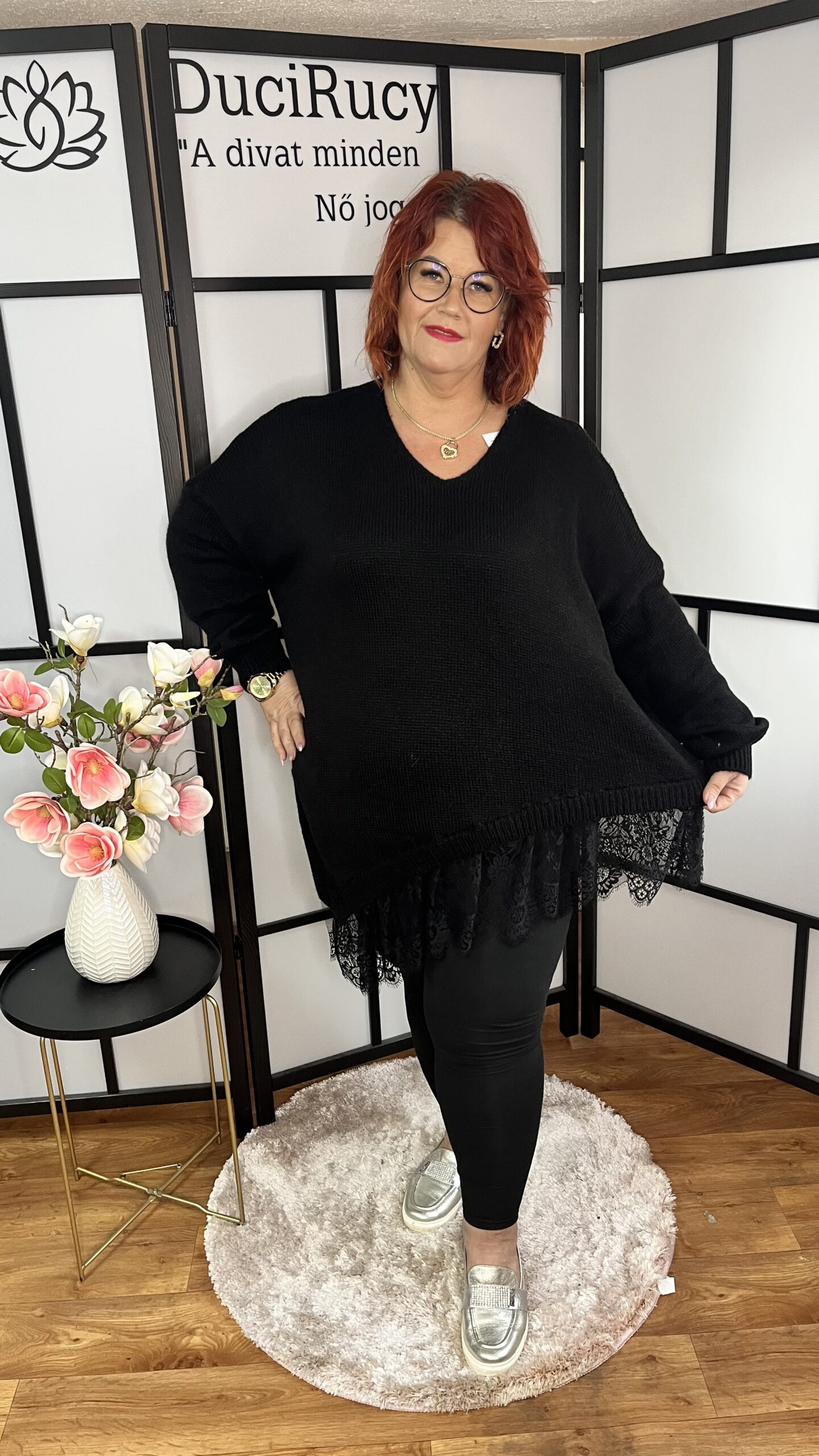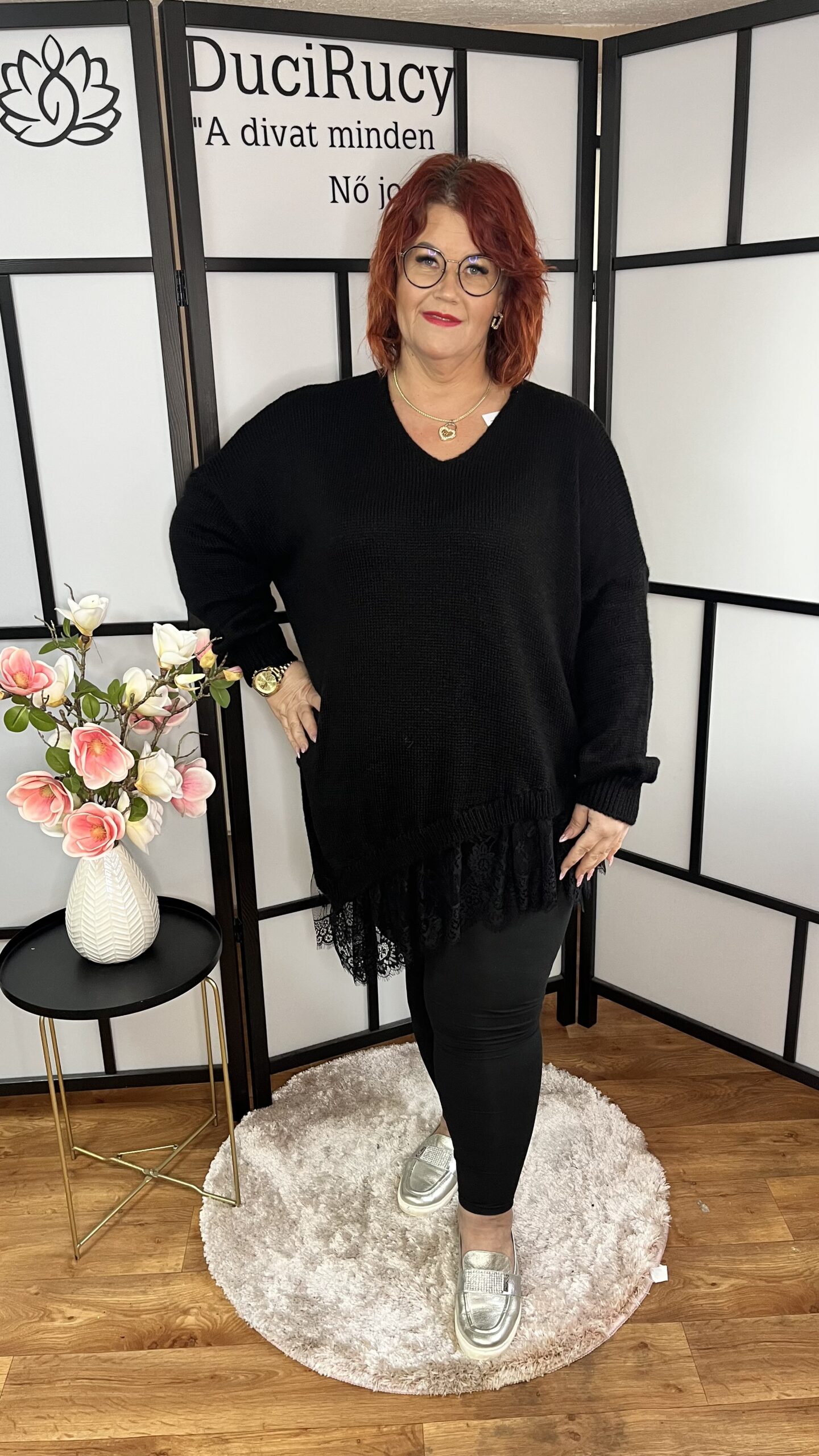 V nyakú, pihe-puha akril anyagból készült, alján csipkével díszített tunika/pulóver. A tunika/pulóver anyaga rugalmas. Igazán mutatós, trendi darab.