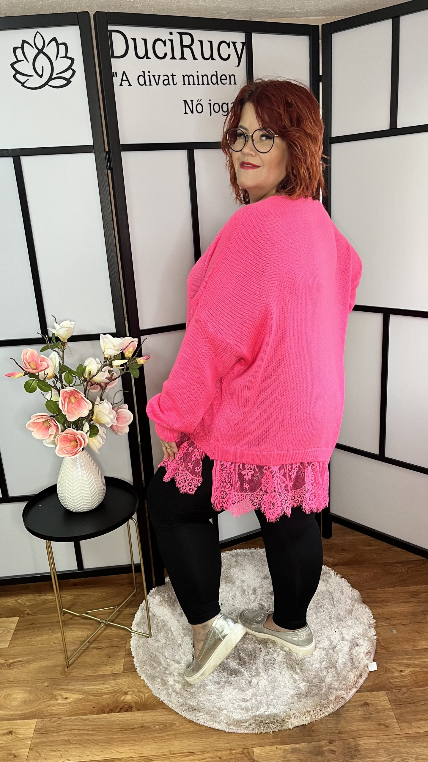 V nyakú, pihe-puha akril anyagból készült, alján csipkével díszített tunika/pulóver. A tunika/pulóver anyaga rugalmas. Igazán mutatós, trendi darab.