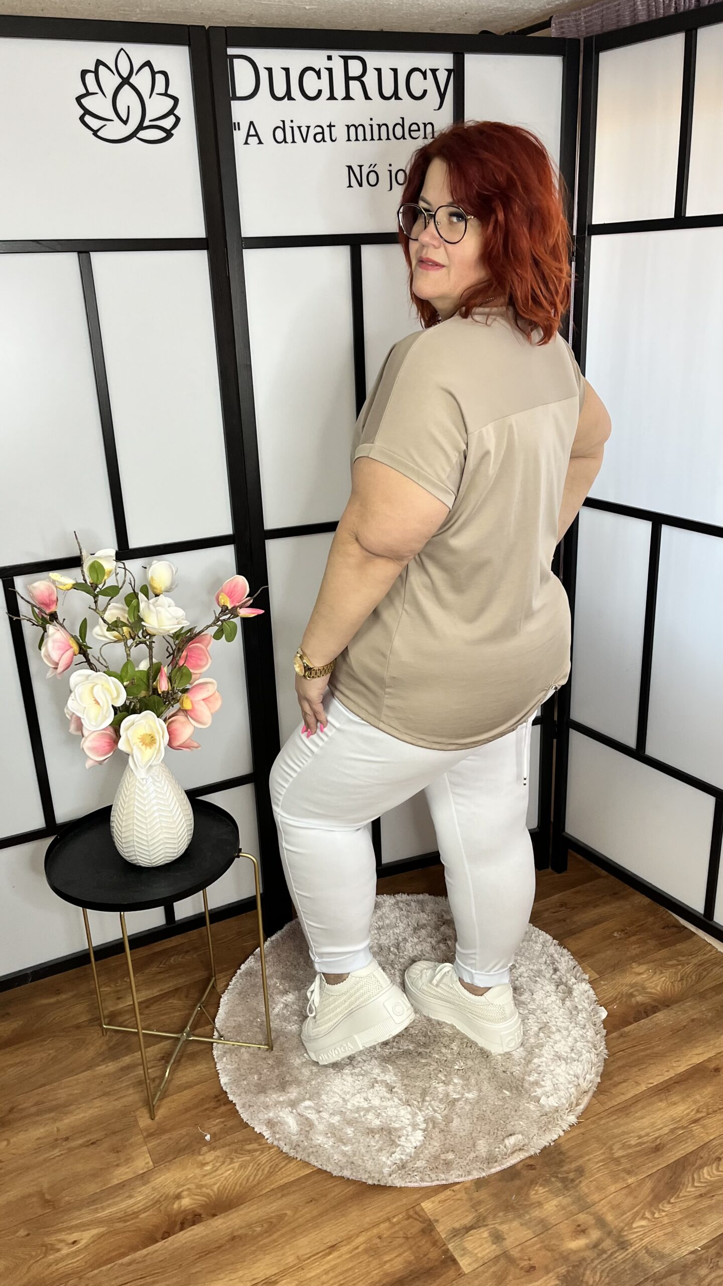 V nyakú, ezüst levél mintás, alul megköthető fazonú pamut póló fango színben