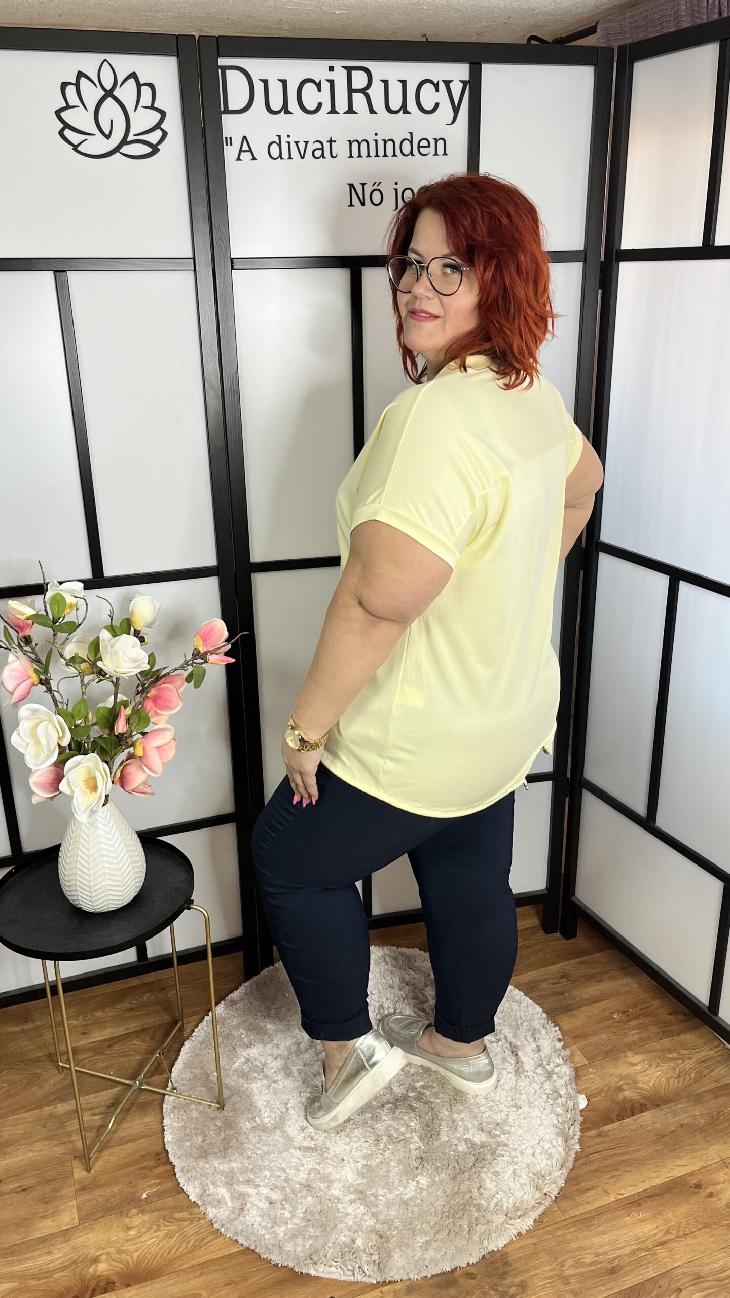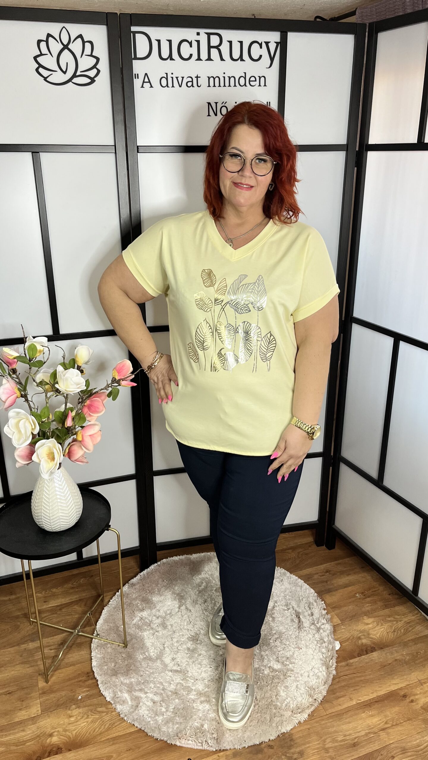 Szuper pamut anyagból készült, V nyakú, ezüst levél mintával díszített, alul megköthető fazonú póló. A póló anyaga rugalmas.