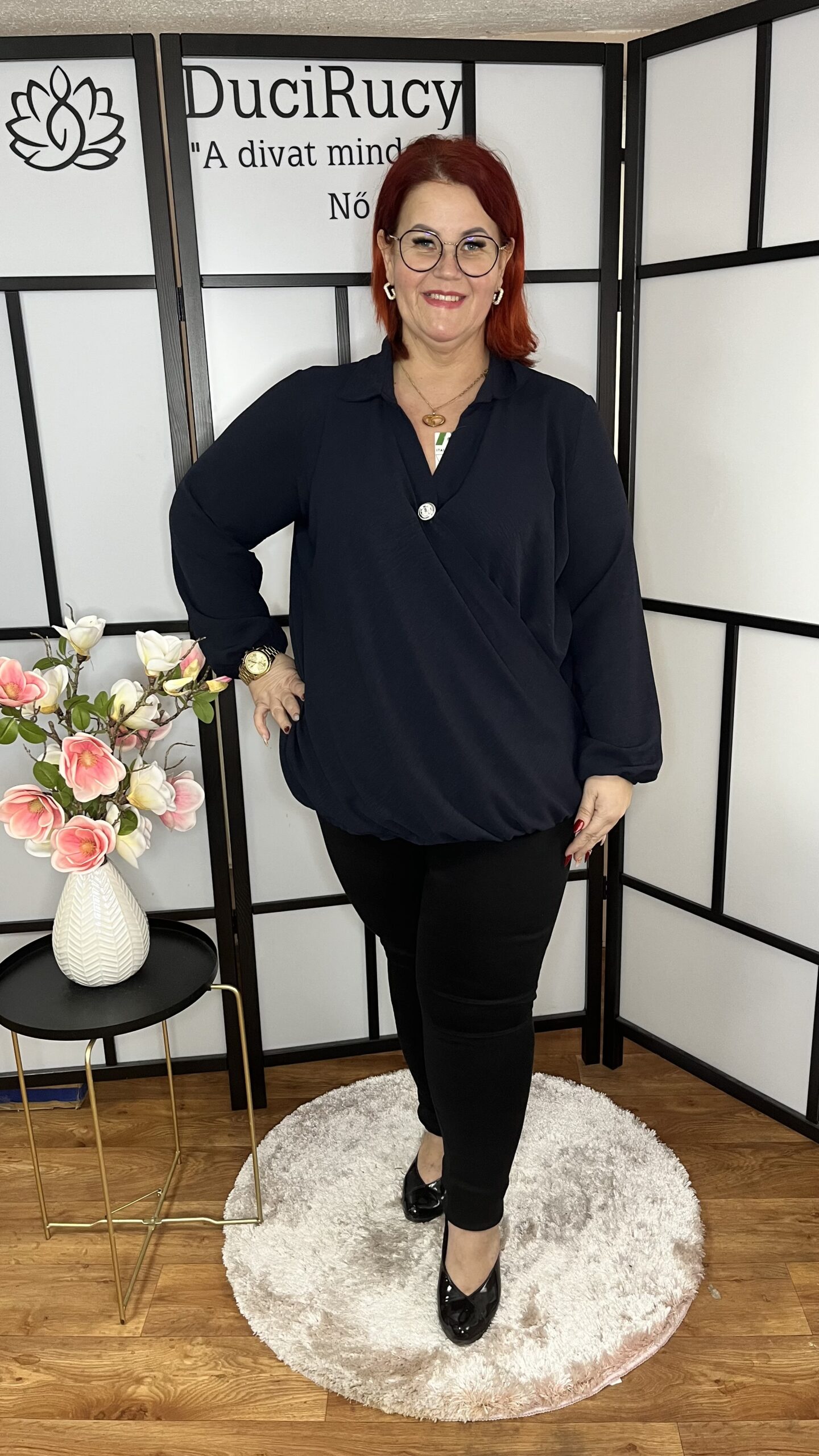Olasz, V nyakú, galléros, zsorzsett anyagból készült, gumis aljú, átlapolt fazonú gyönyörű blúz. Bármilyen alkalommal megállja a helyét, igazi nagy méretezés, kimondottan ott takar, ahol kell. Az átlapolt rész 1 gombbal lett díszítve.
