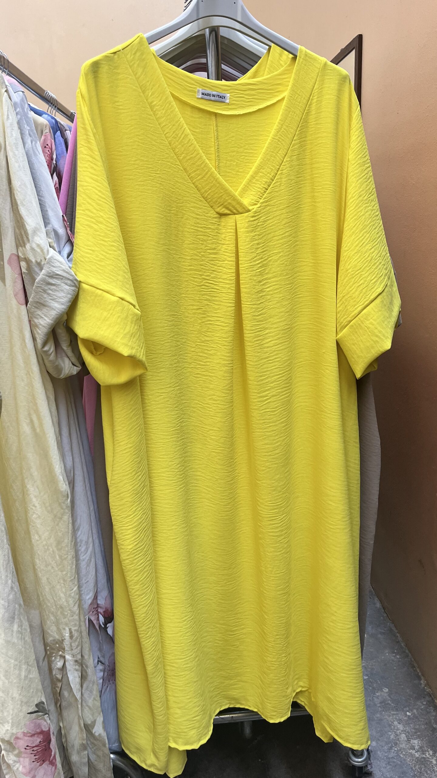Olasz extra minőségű és méretű gyönyörű ruha zsebén köves díszítéssel púder színben