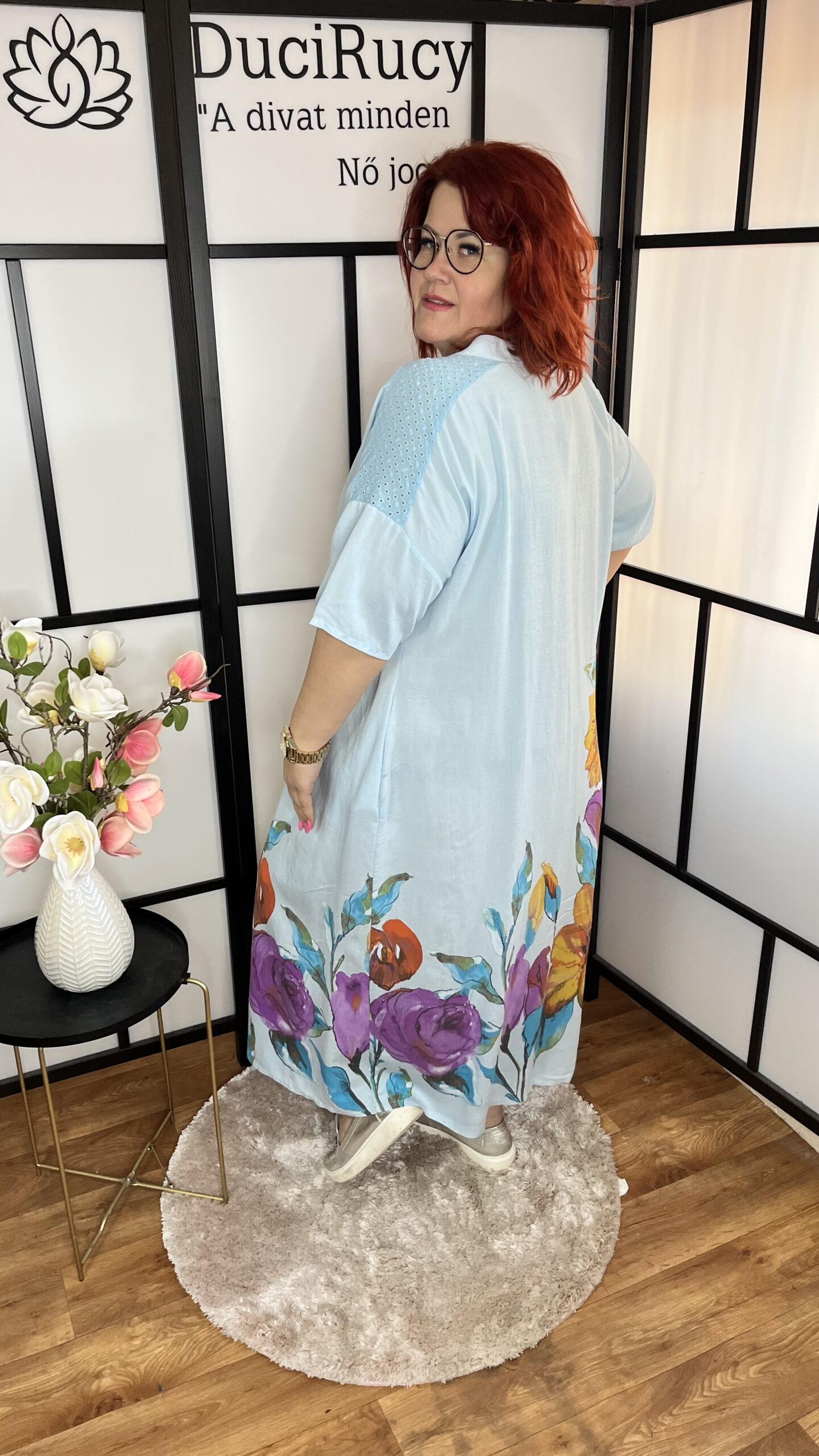 Olasz, V nyakú, zsebes maxi ruha. A ruha alján elöl-hátul virágminta található. A ruha anyaga nem rugalmas. Nagyon előnyös fazon.