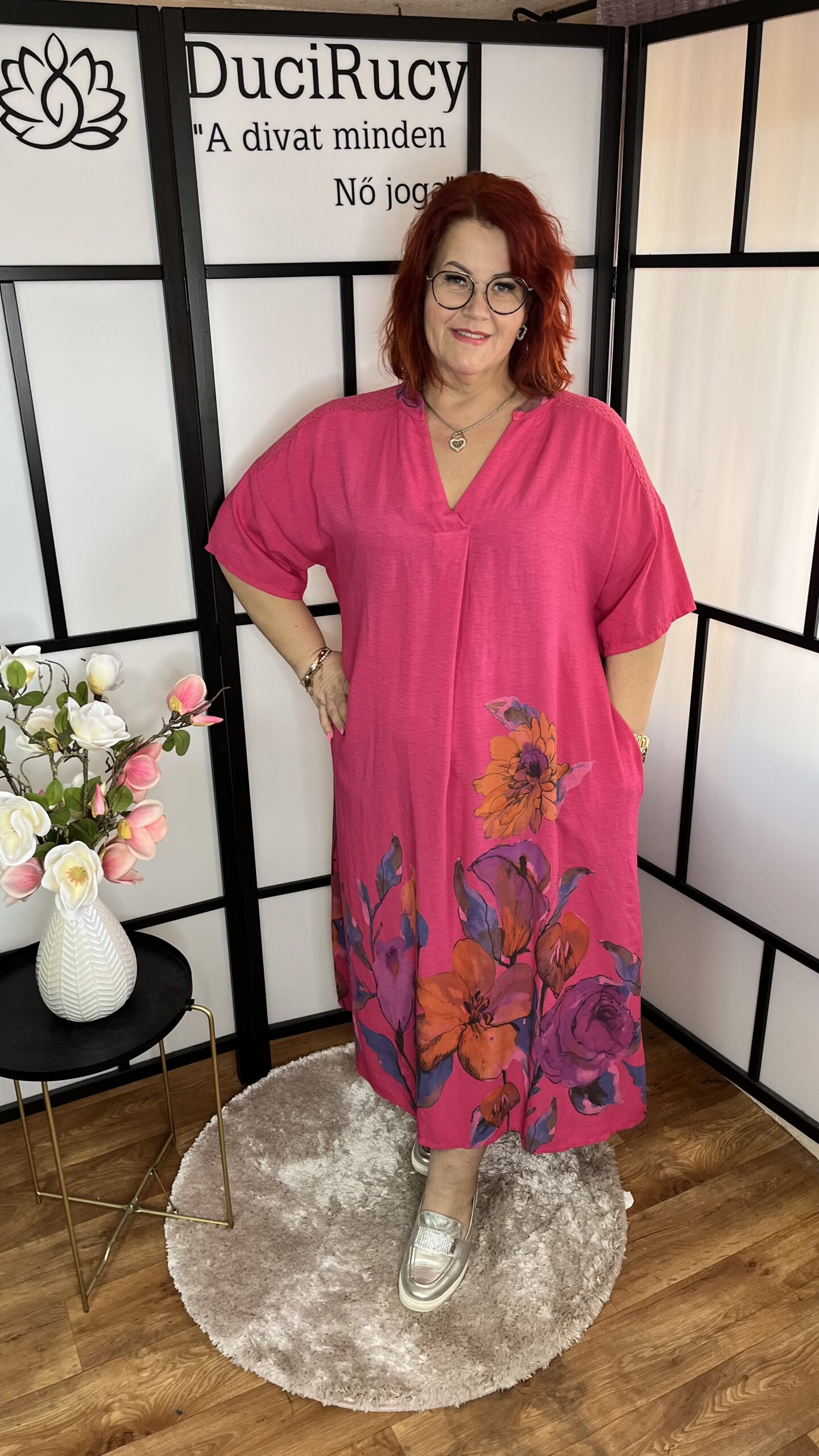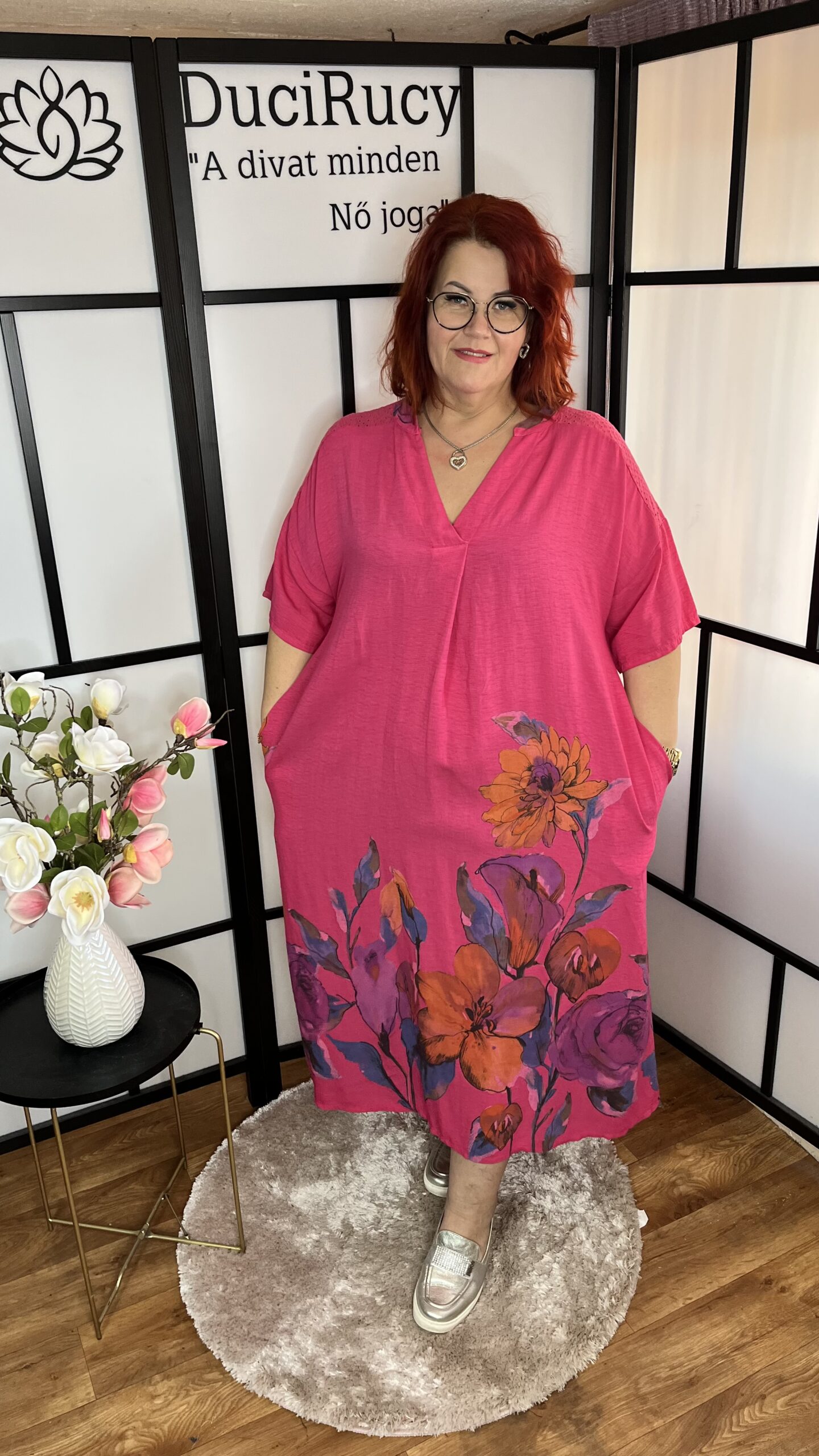 V nyakú madeirás vállú virágos zsebes maxi ruha magenta színben