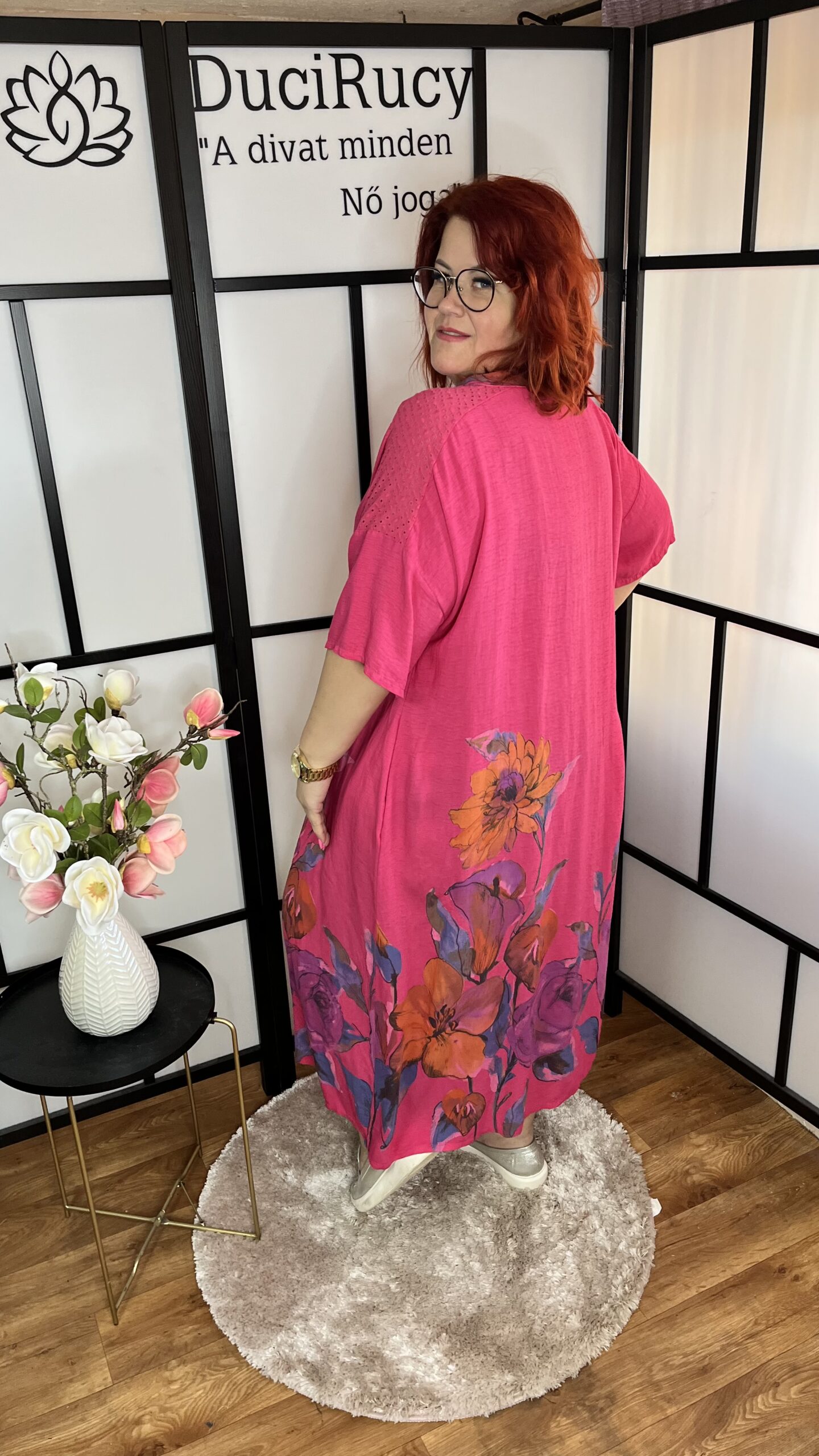 Olasz, V nyakú, zsebes maxi ruha. A ruha alján elöl-hátul virágminta található. A ruha anyaga nem rugalmas. Nagyon előnyös fazon.