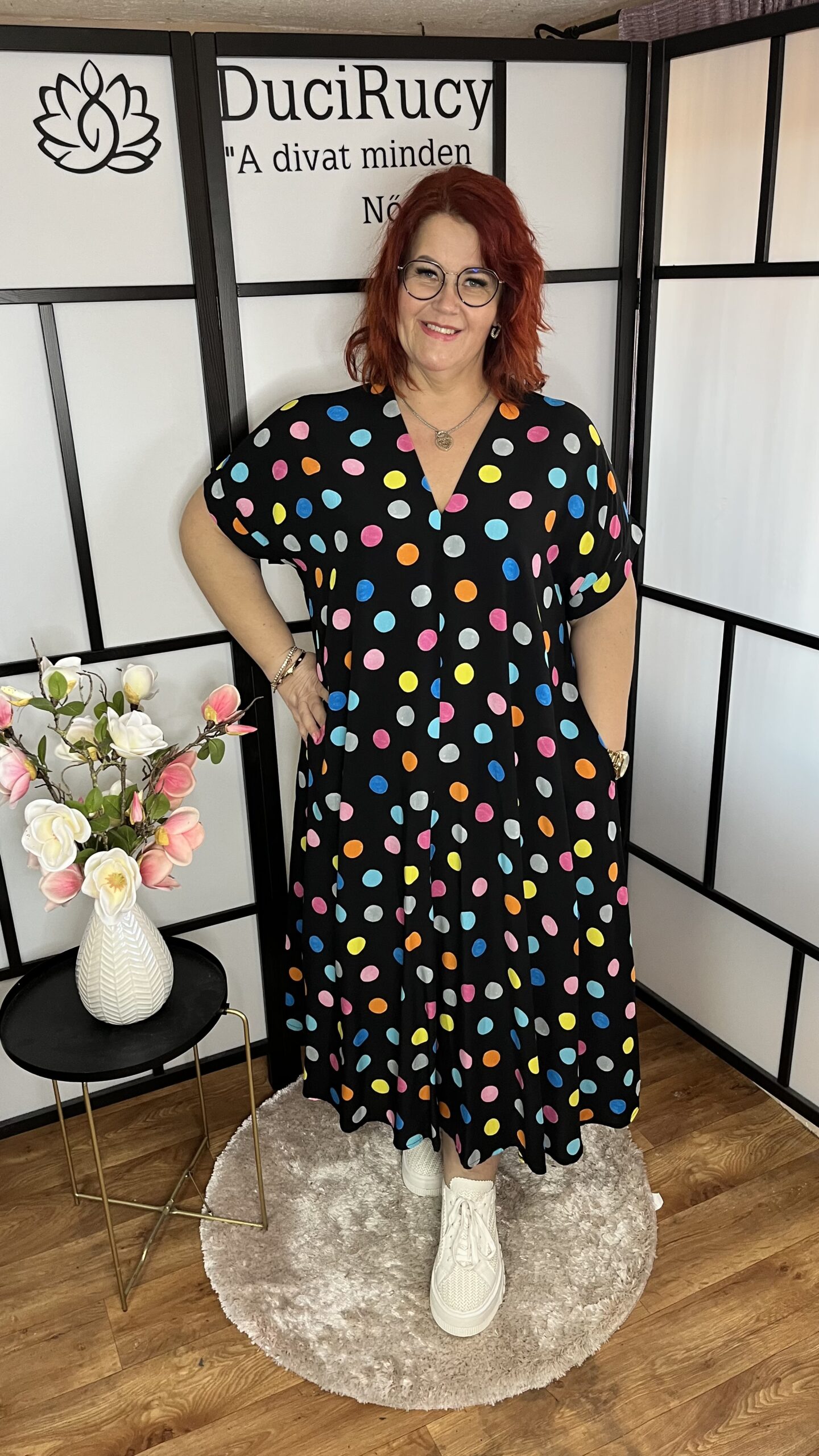 Színes pöttyös, V nyakú, zsebes fazonú, könnyed flokon anyagú maxi ruha mennyiség