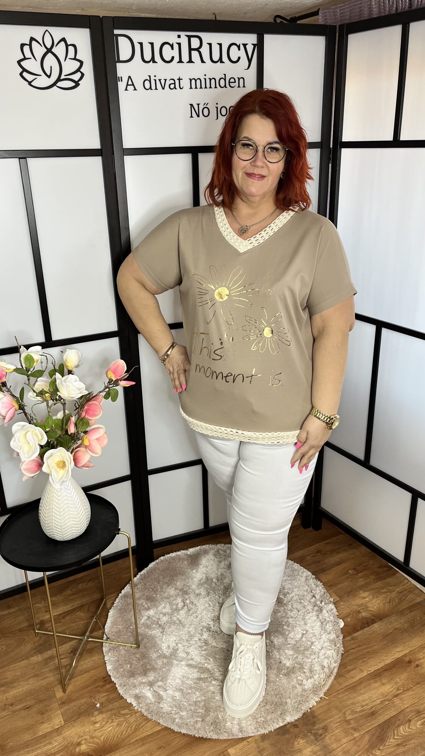 Szuper pamut anyagból készült, V nyakú, arany virág mintás póló, melynek nyakrésze és az alja horgolással díszített. A póló anyaga rugalmas.
