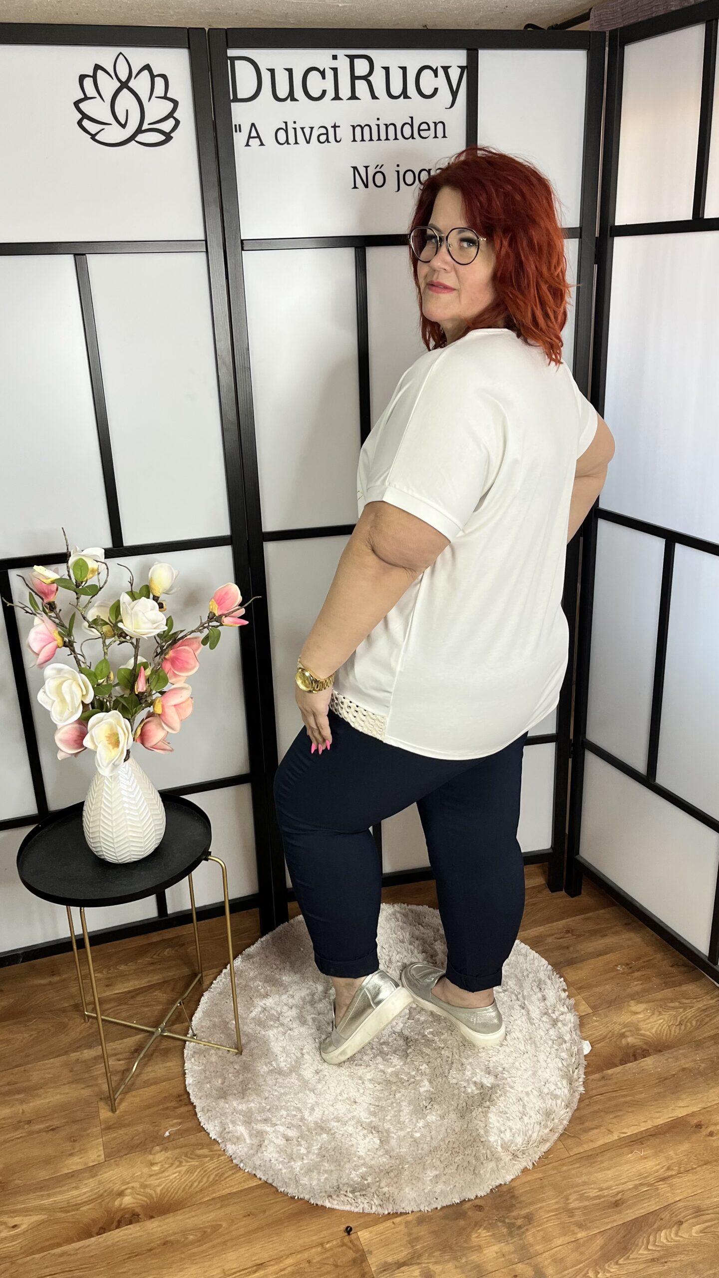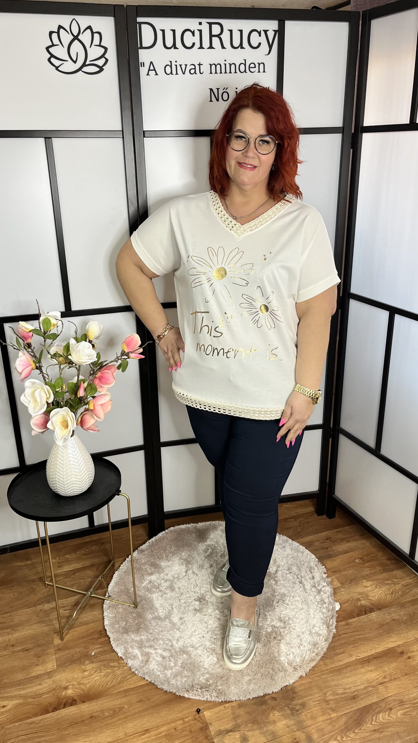 Szuper pamut anyagból készült, V nyakú, arany virág mintás póló, melynek nyakrésze és az alja horgolással díszített. A póló anyaga rugalmas.