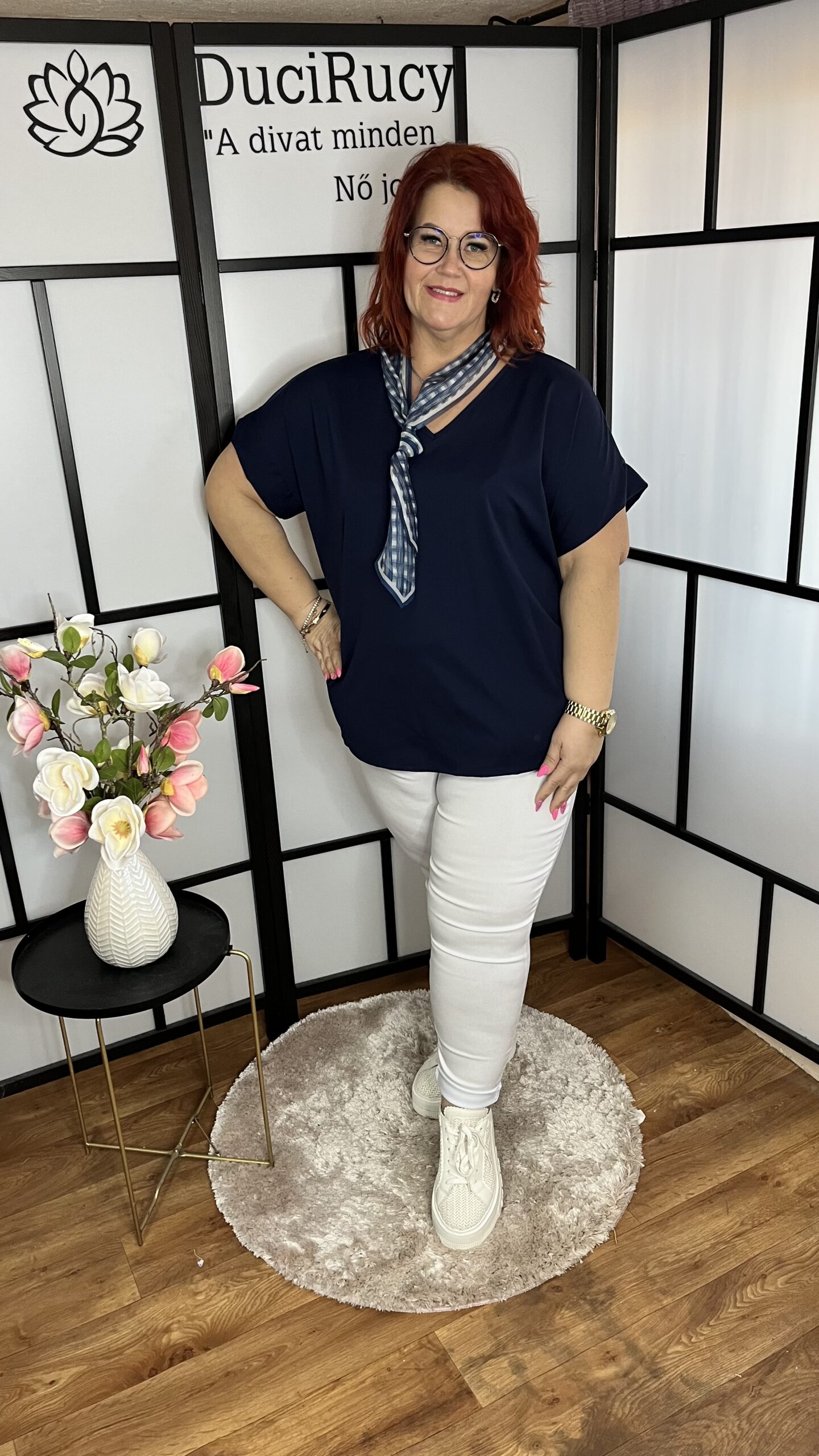 V nyakú, galléros, gumis aljú, extra méretű átlapolt fazonú zsorzsett blúz sötétkék színben