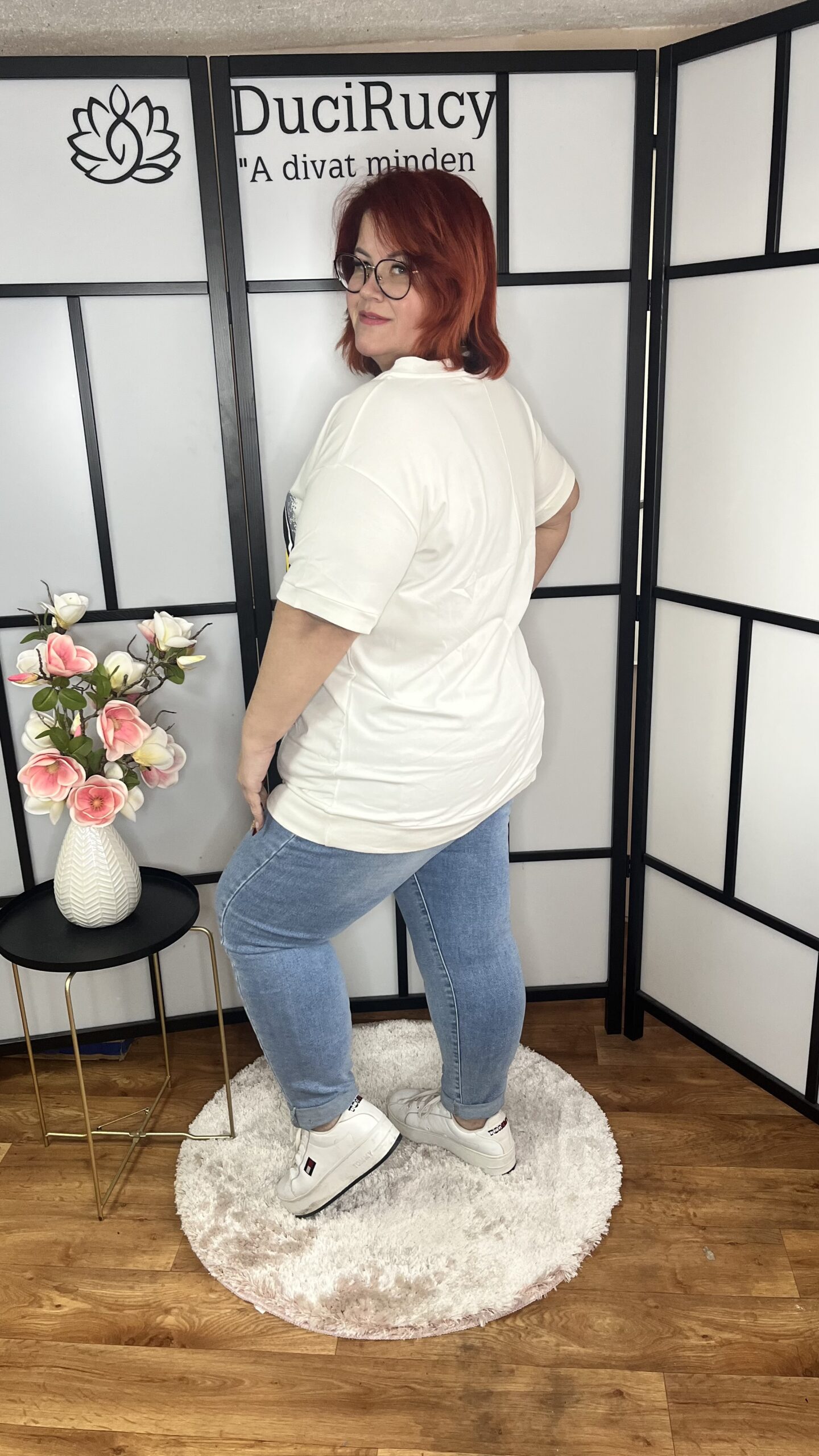 V nyakú, török, pamut Minnie egérrel díszített felső fehér színben