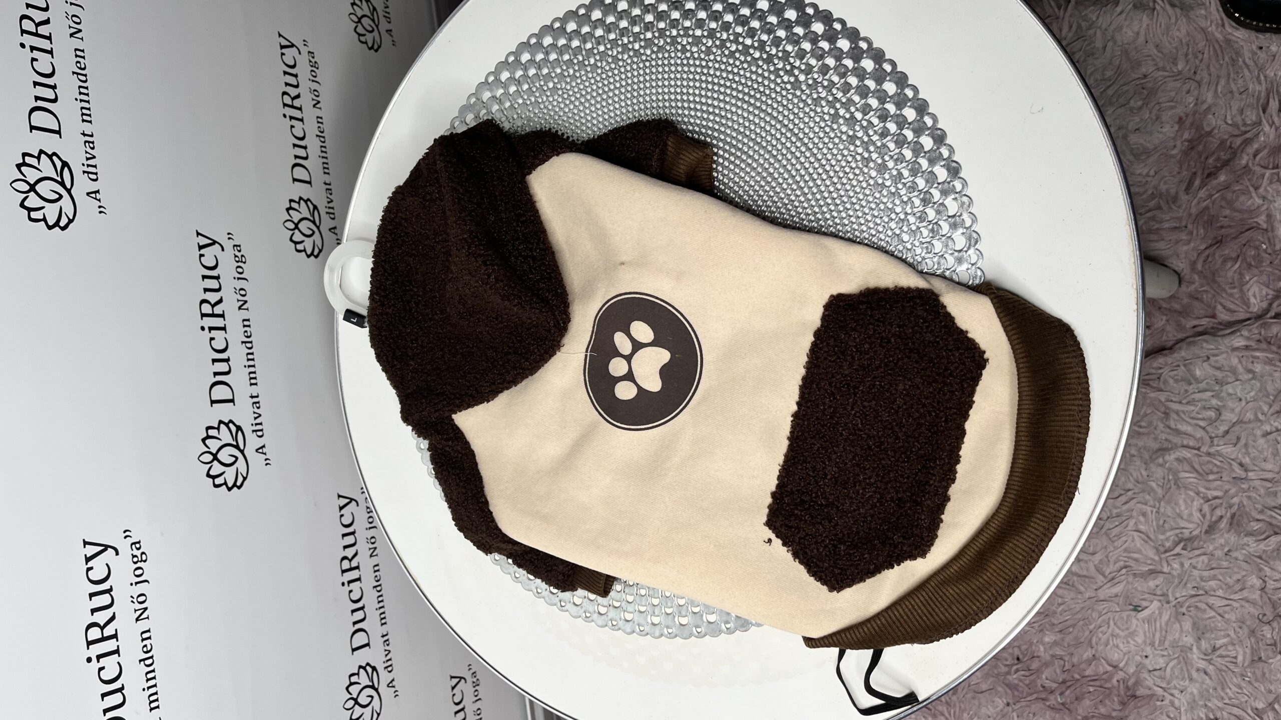 Vastag pamut, bukléval kombinált, kapucnis, belül polár, kenguru zsebes, mancsos, kutyaruha. Ez biztosan kedvencünk nagy kedvence lesz!