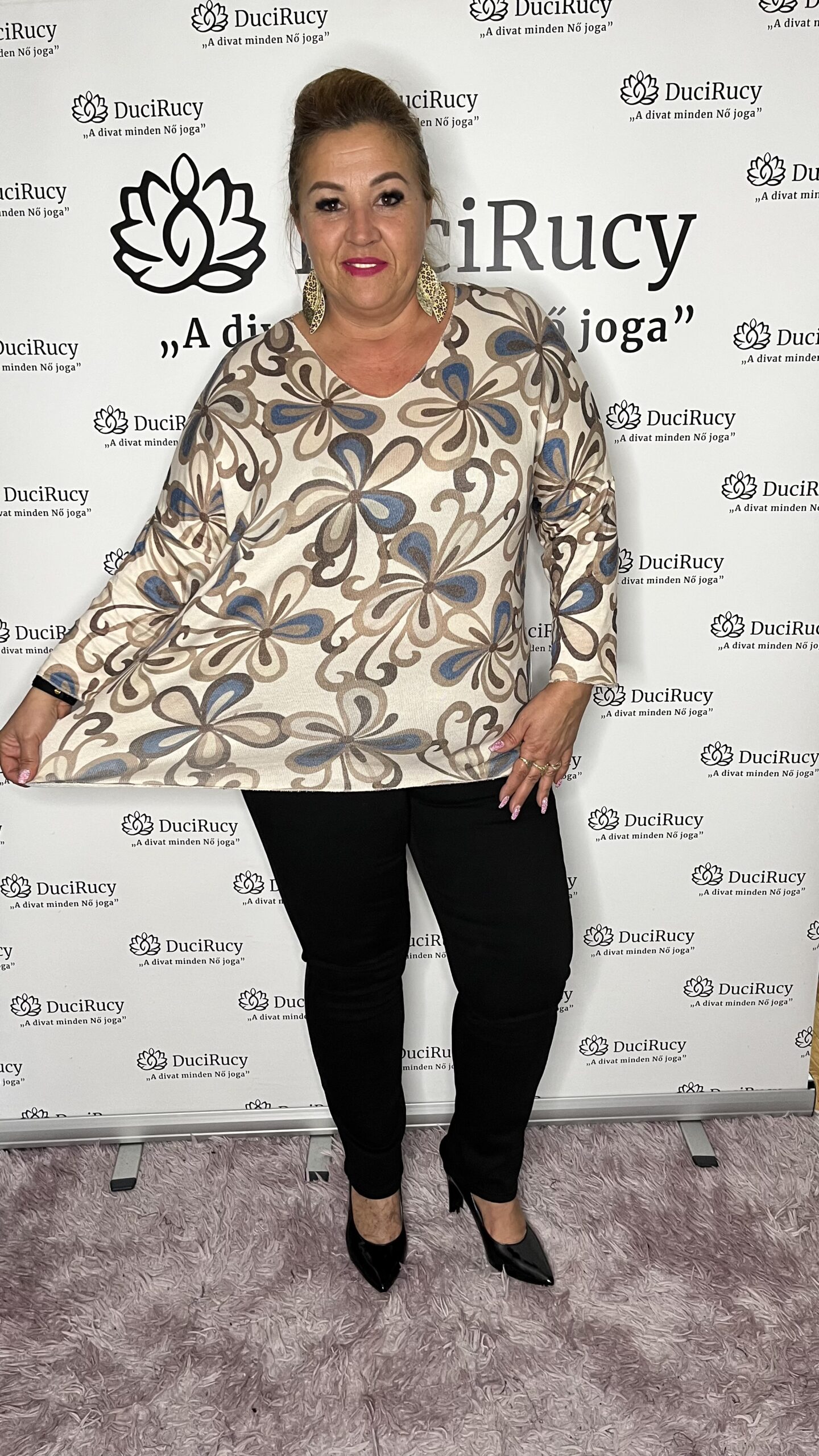 Olasz, v nyakú, vékonyabb gépi kötésű felső gyönyörű barna virágmintával.  Kötött anyagának köszönhetően extra rugalmas anyagú. Enyhén denevér fazon (T-ujjú).
