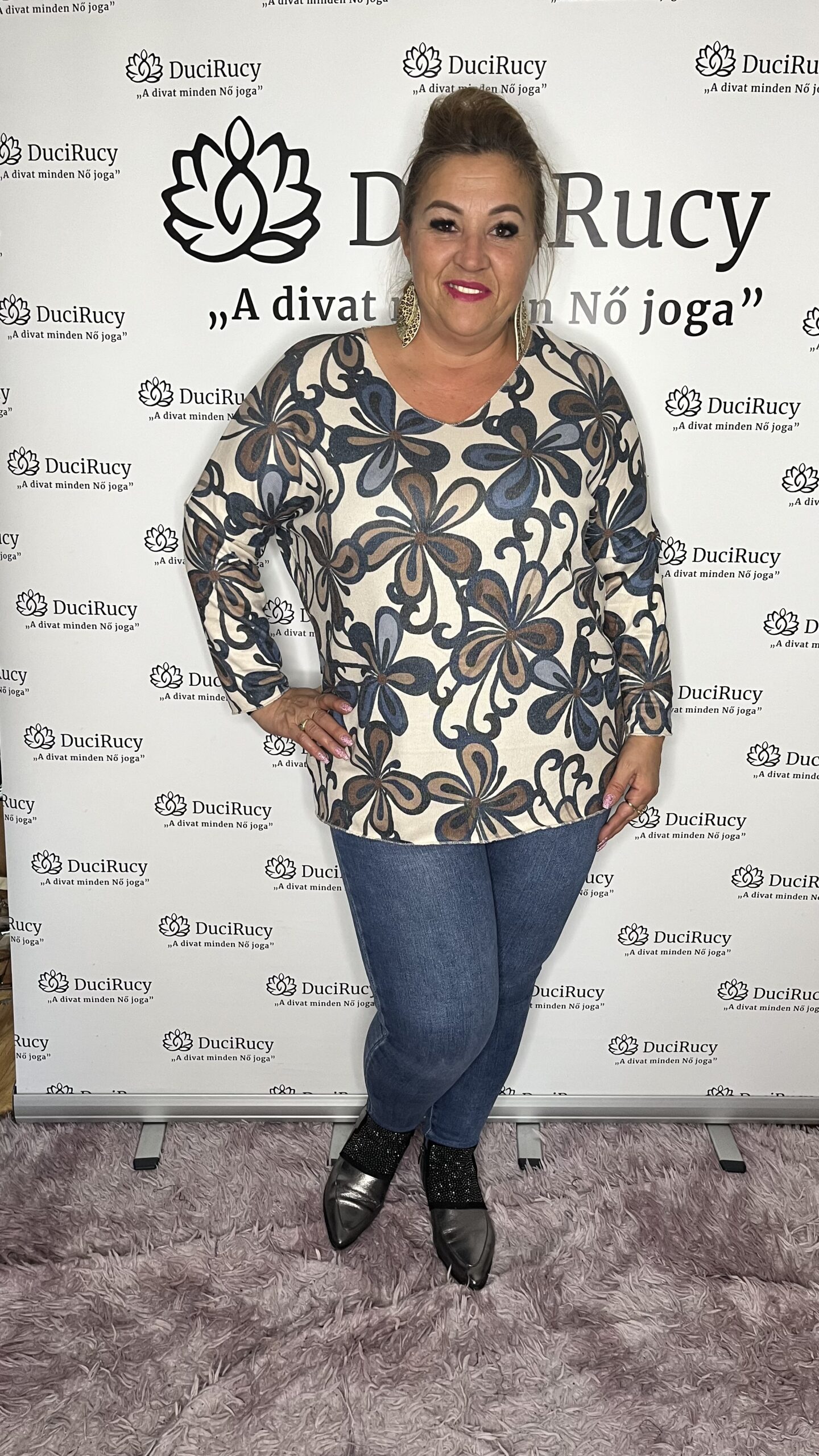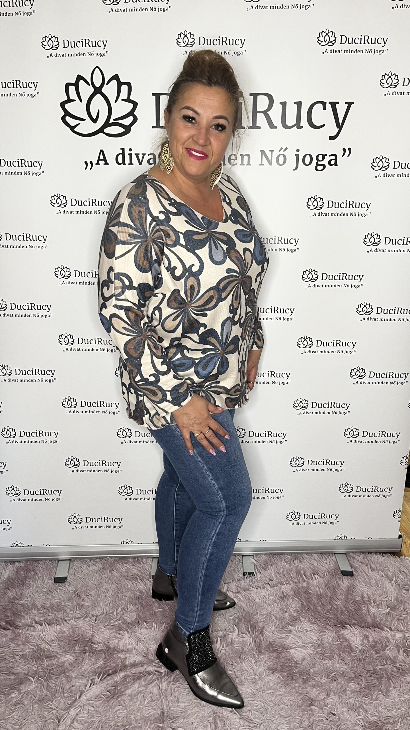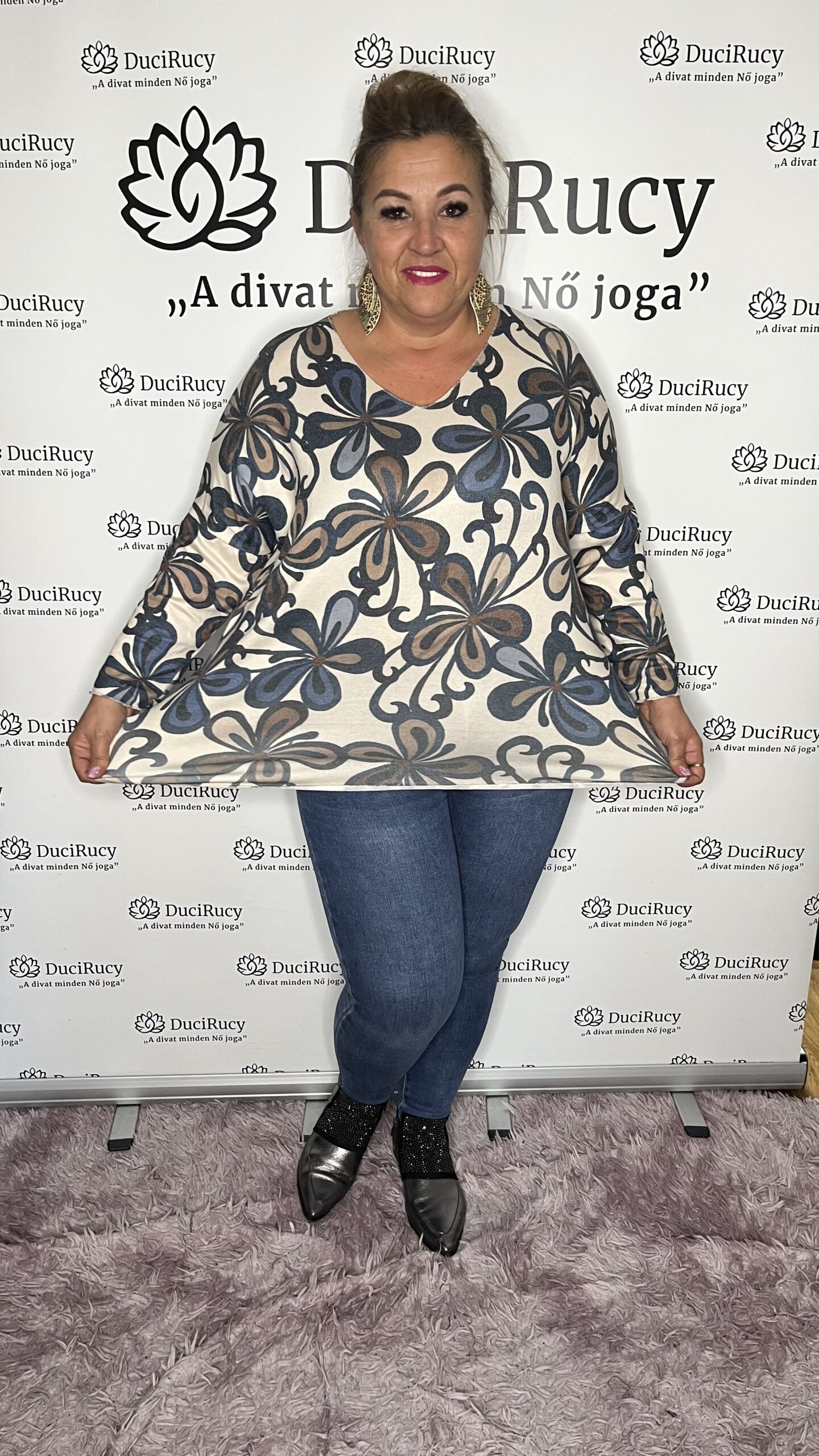 Olasz, v nyakú, vékonyabb gépi kötésű felső gyönyörű kék virágmintával. Kötött anyagának köszönhetően extra rugalmas anyagú. Enyhén denevér fazon (T-ujjú).