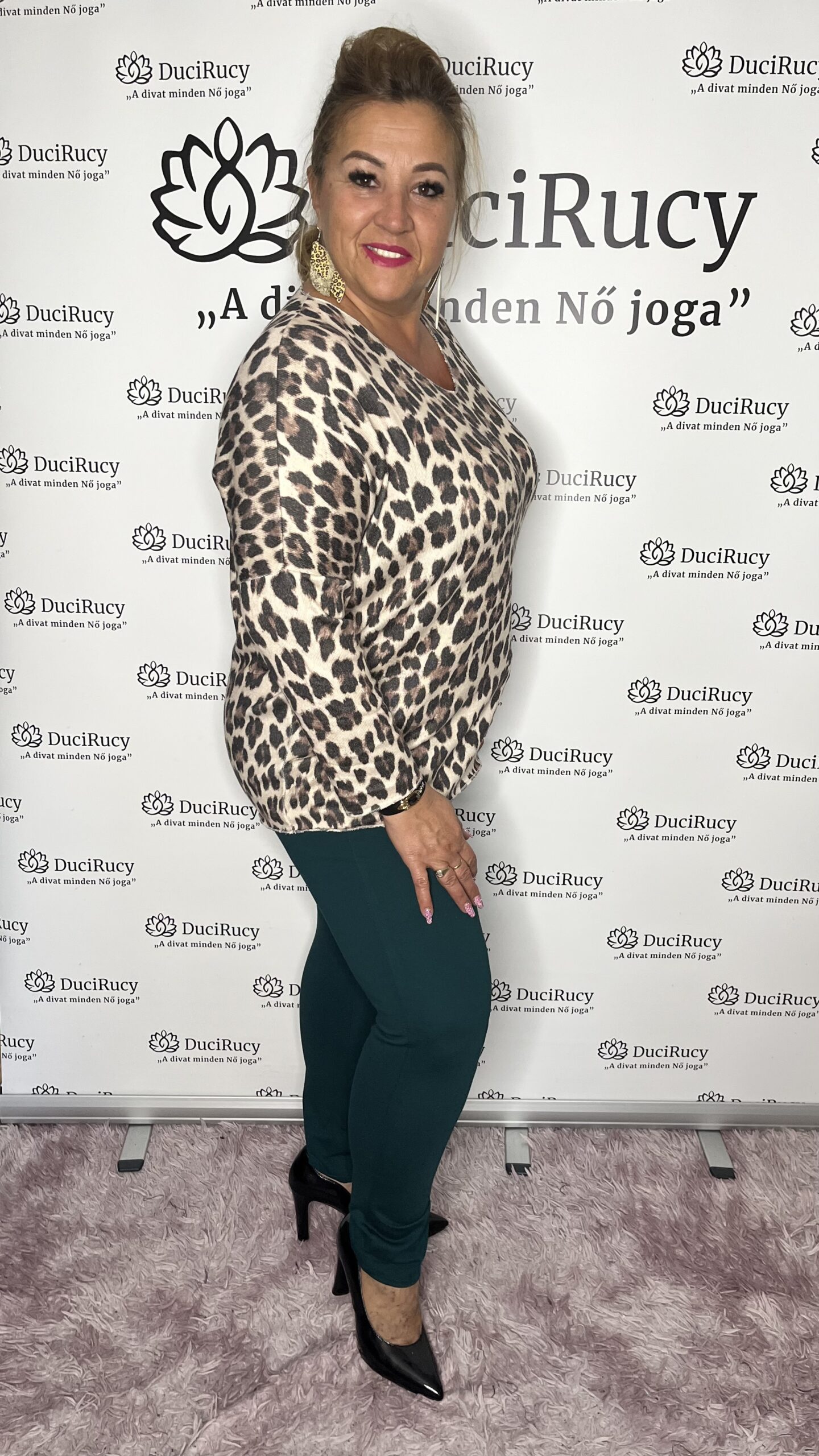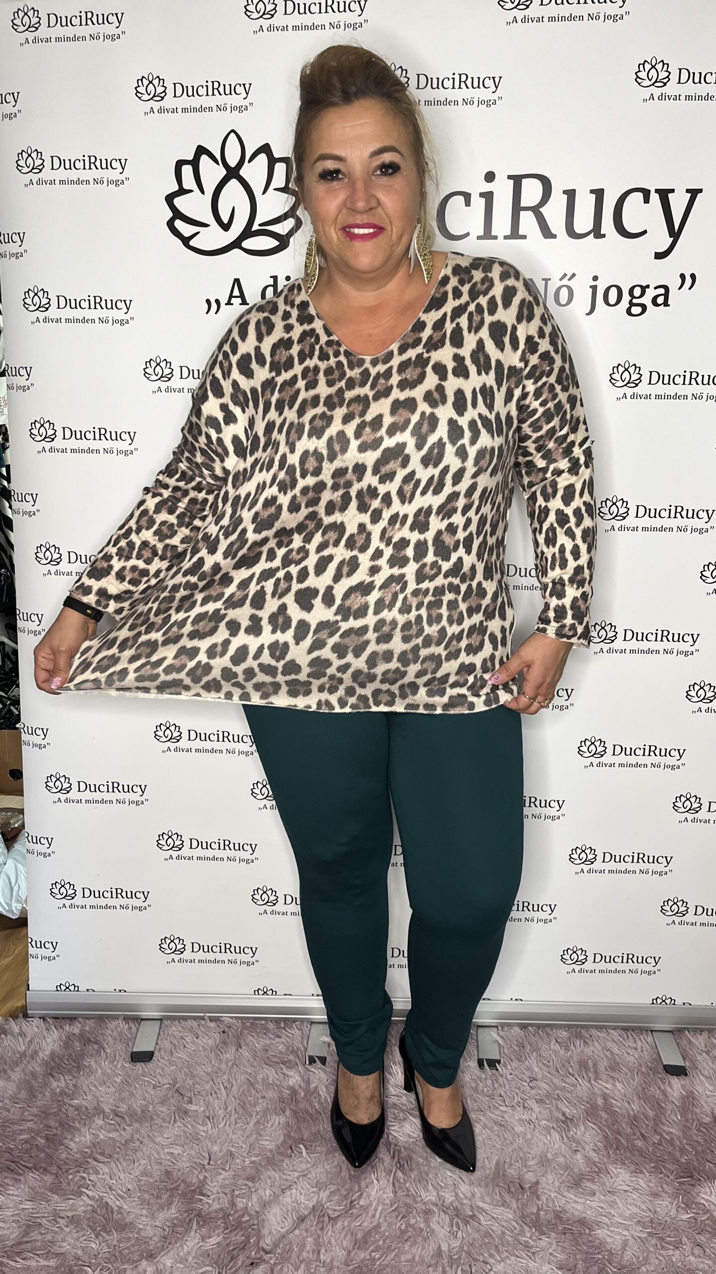 Olasz, v nyakú, vékonyabb gépi kötésű felső gyönyörű párduc mintával. Kötött anyagának köszönhetően extra rugalmas anyagú. Enyhén denevér fazon (T-ujjú).