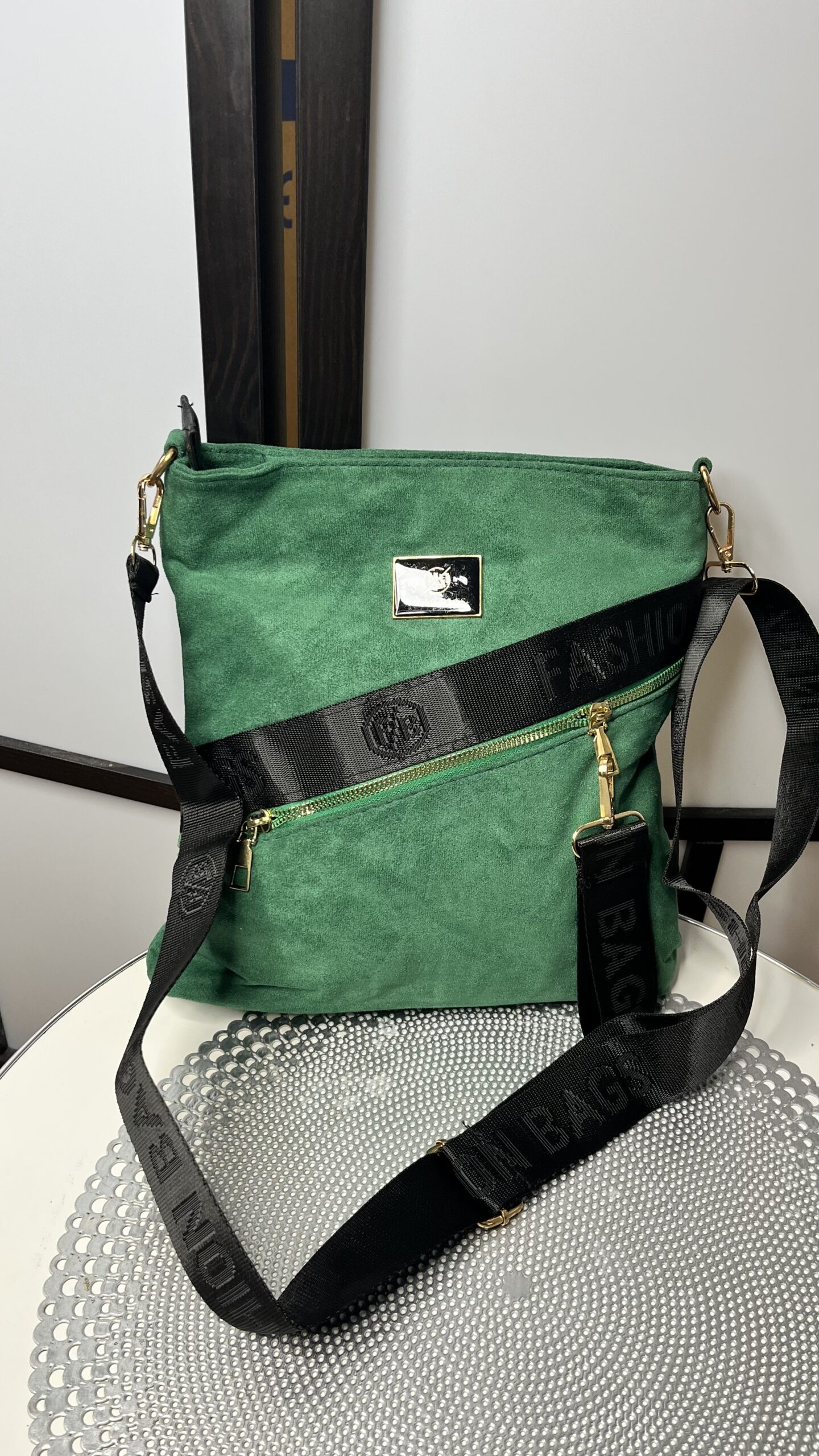 Velúr hatású klasszikus fazonú oldaltáska zöld színben