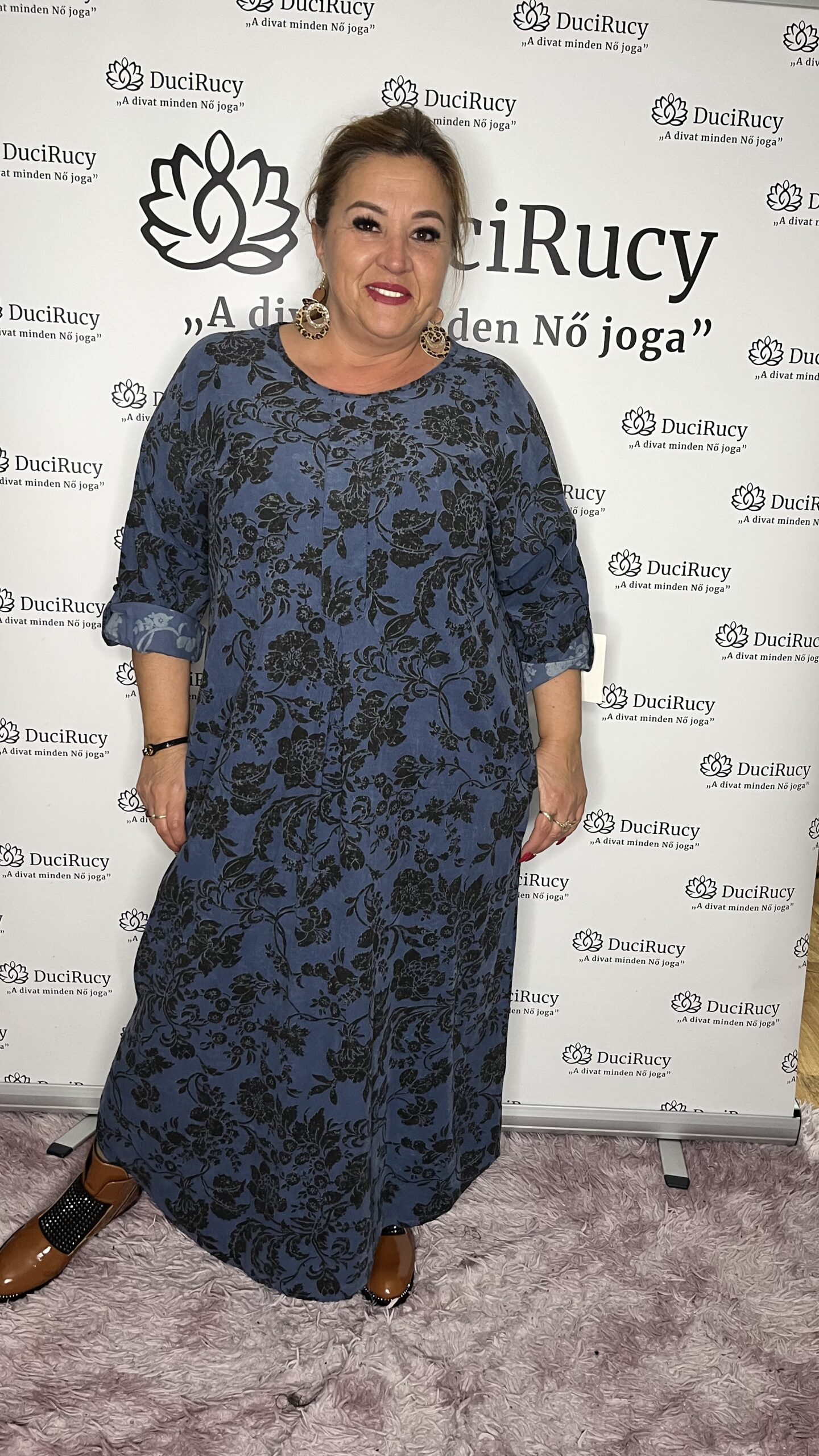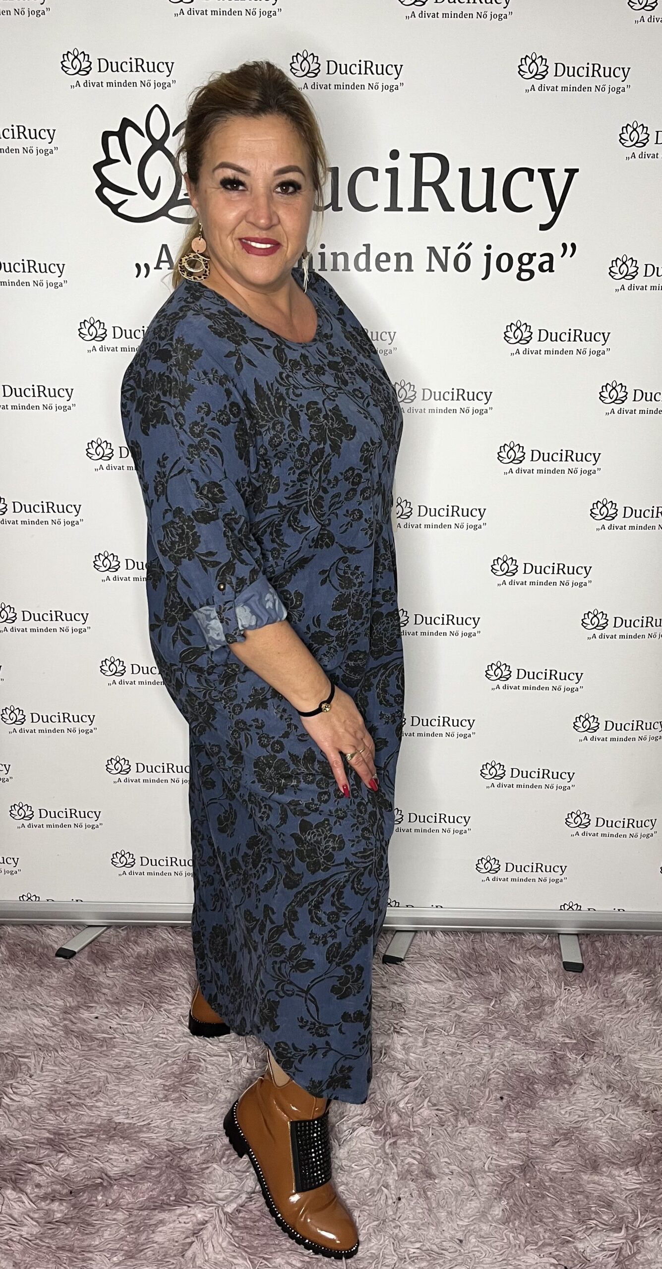 Virágmintás kord bársony kerekített maxiruha farmerkék színben