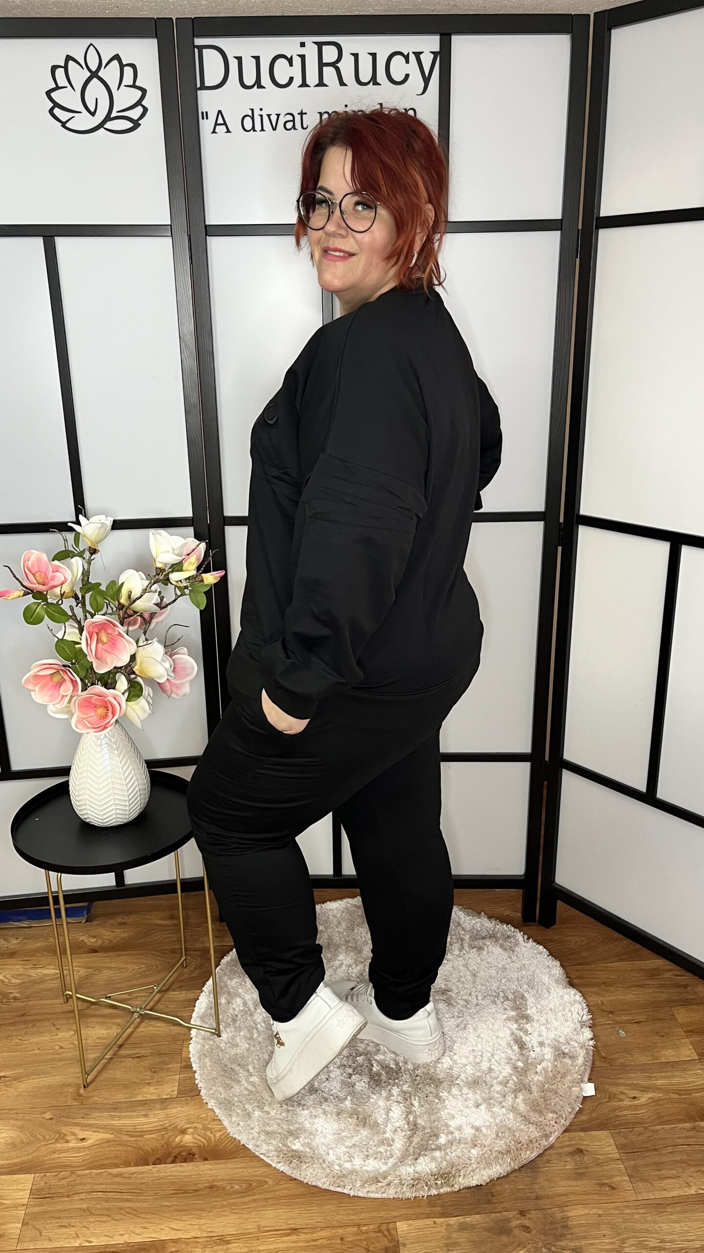 Pamut anyagból készült szabadidő együttes. Normál szabadidő fazon, a nadrág gumis derekú, zsebes fazon, alul passzés, illetve a felső ujja és alja szintén passzés. Az együttes anyaga rugalmas.