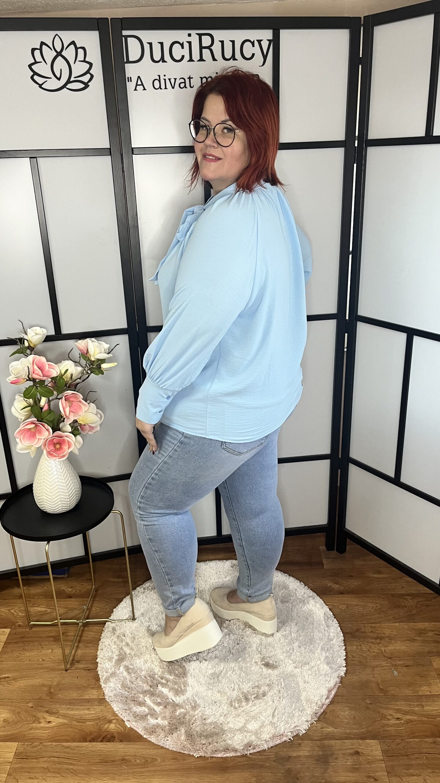 Zsorzsett anyagú, megköthető nyakú, egyenes fazonú felső világoskék színben